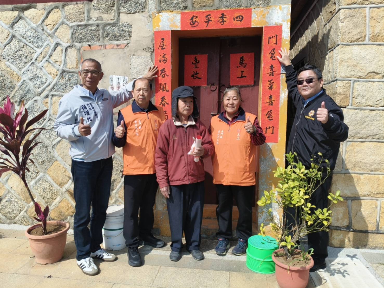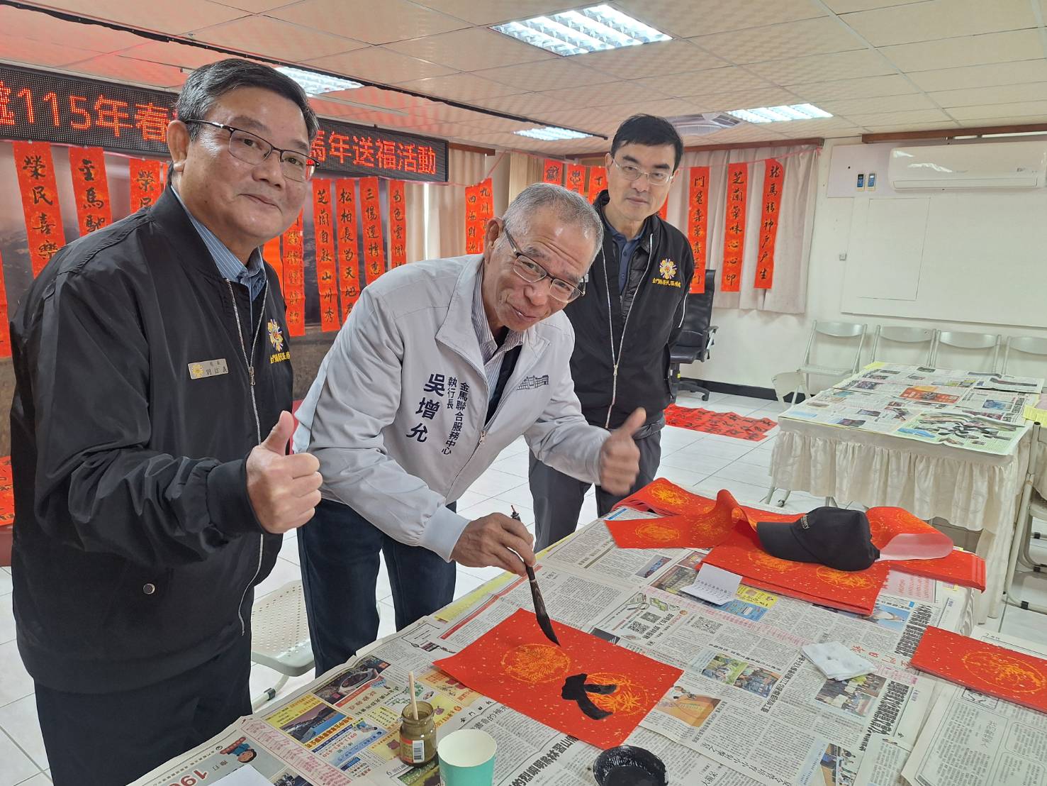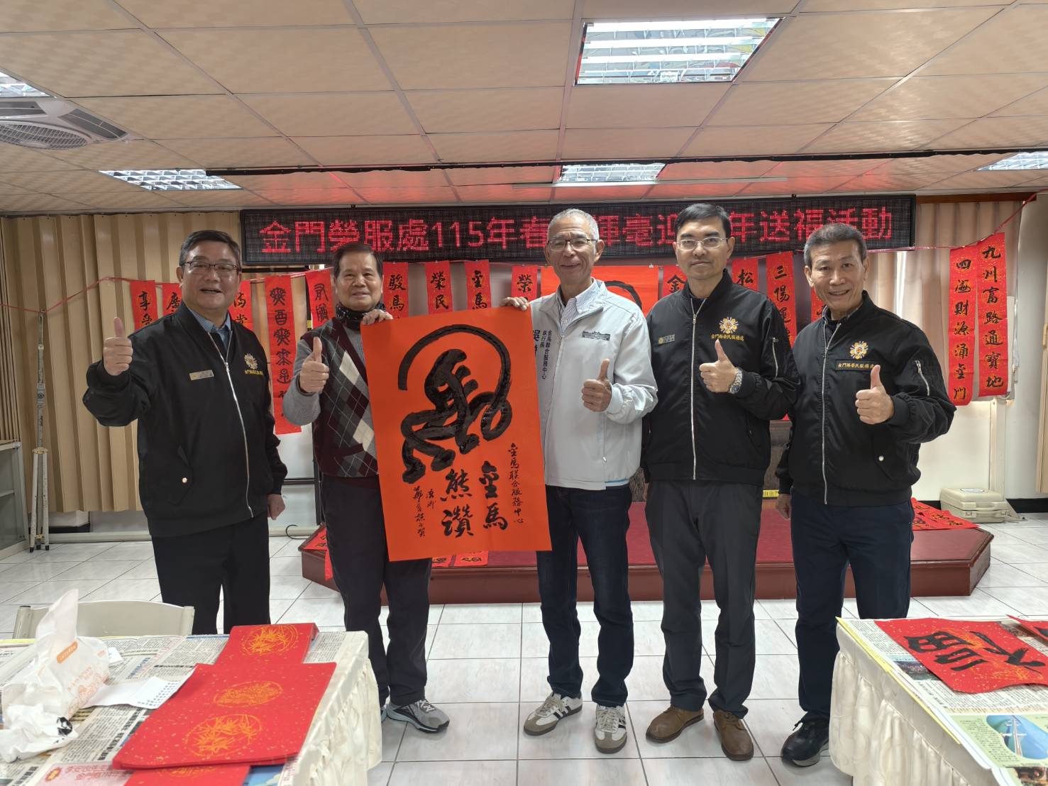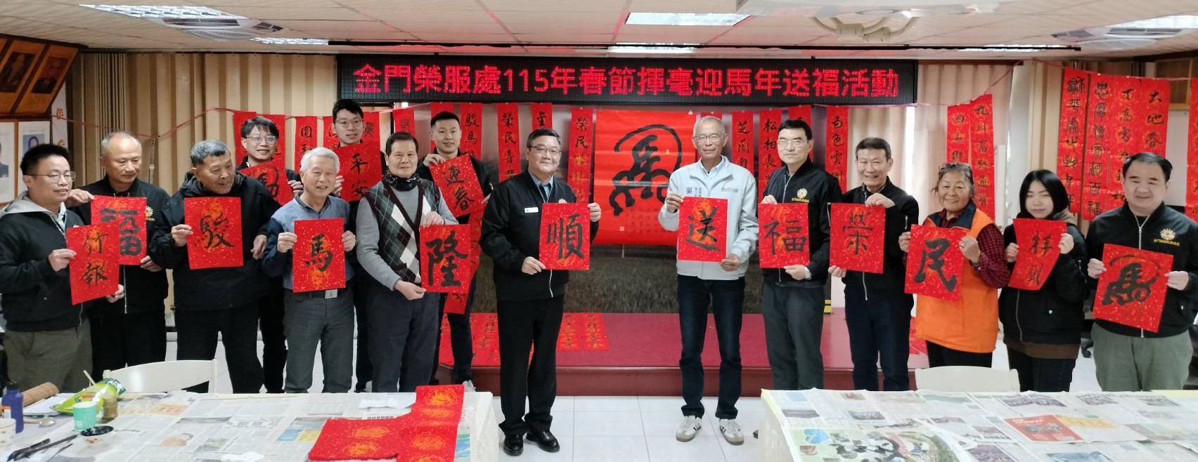 為配合國人農曆年節張貼春聯的傳統習俗,金門縣榮民服務處在財團法人榮民榮眷基金會及會屬事業機構的支持下,於3日在榮服處五樓會議室共同辦理「寫春聯、送祝福」書法活動,邀請將軍書法家鄭有諒、前處長呂媽定,以及金門書法學會陳應德老師齊聚一堂揮毫,書寫春聯贈送地區榮民眷,讓大家提前感受濃厚的過年氣氛。 活動開始前,金門榮服處劉信義處長除逐一介紹與會書法老師外,並致贈紀念禮品,感謝老師們在百忙之中義務協助,為服務區內行動不便及年長榮民長輩書寫春聯。行政院金馬聯合服務中心吳增允執行長亦親臨現場揮毫,並與劉信義處長、彭致和副處長、李全順總幹事及書法老師們共同寫下「駿馬隆順送福榮民」等祝福語,向地區榮民拜早年,祝賀榮民前輩馬年行大運。 考量地區年長榮民對傳統年節習俗相當重視,惟因年事已高或行動不便,較難親自到場排隊領取春聯,活動結束後,劉信義處長特別陪同吳增允執行長前往服務區,親自將春聯送至年長榮民楊婆婆及吳伯伯家中,並協助張貼。兩位榮民前輩對於行政院金馬聯合服務中心與榮服處人員親送春聯到府,均表達由衷感謝與歡喜之情。 劉信義處長表示,春節揮毫活動已連續辦理第三年,協助揮毫的三位老師本身也都是榮民,深知榮民長輩的需求。此次特別關懷單身、年長獨居或行動不便、無法外出領取春聯的榮民眷,於春節前夕協辦書寫春聯送福活動,更具溫馨意涵。劉處長再次感謝三位老師義務性協助揮毫,共同在年節前展現大愛,將祝福與關懷傳遞給每一位榮民眷。 相關照片