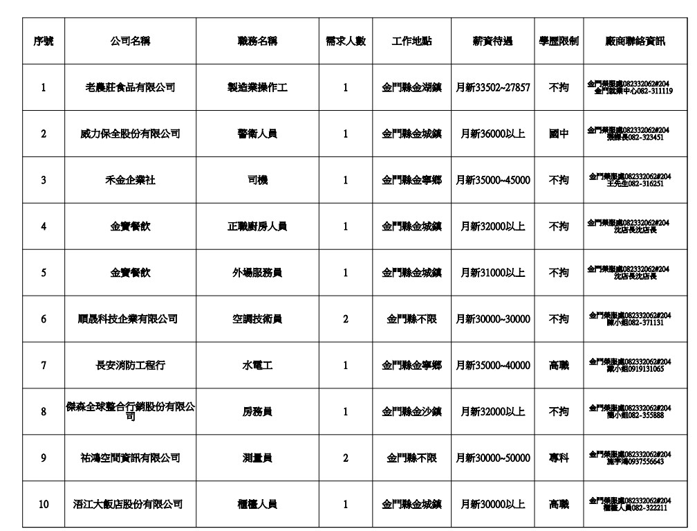 【金門縣榮服處】廠商職缺表(114.11.25)