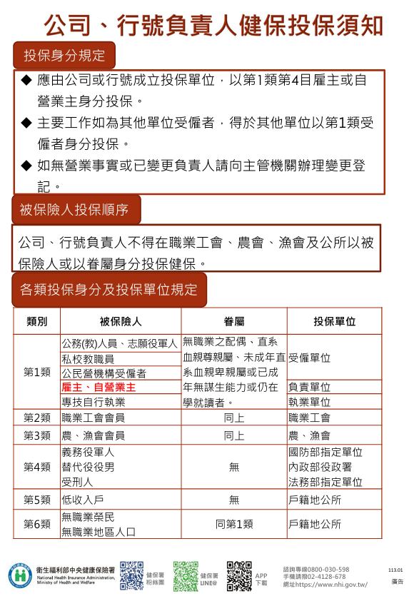 1.按全民健康保險法第10條及第11條規定略以,「雇主及自營業主」為第1類第4目被保險人,第1類至第3類被保險人不得為第6類被保險人,具有被保險人資格者,並不得以眷屬身分投保。
