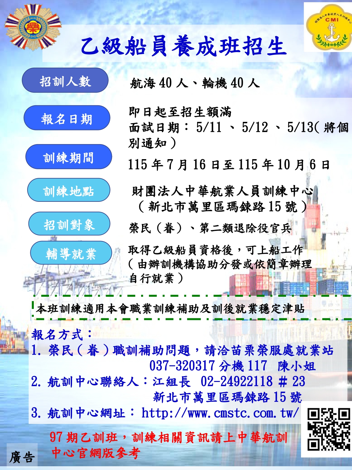 中華航訓乙級船員養成班第97期招生中