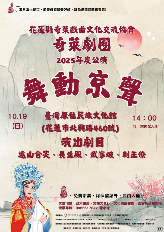 (一)展演日期:114年10月19日(星期日) (二)展演時間:下午2時至5時止。 (三)地點;臺灣原住民族文化館(花蓮縣花蓮市民享里北興路460號) (四)場館資訊網址: https://www.facebook.com/HualienCountyIndigenousPeoplesCulturalCenter。