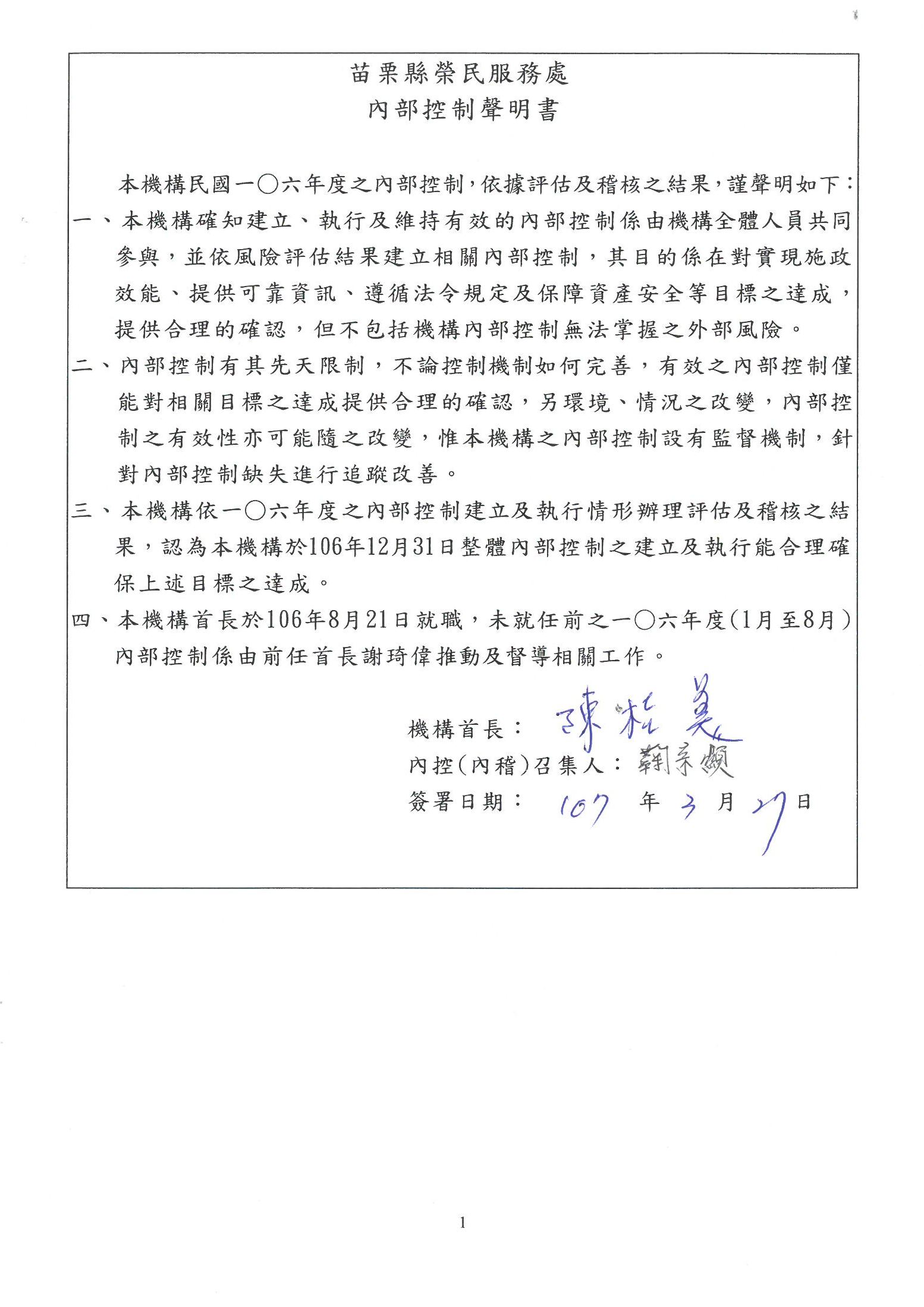 本機構民國一○六年度之內部控制,依據評估及稽核之結果,謹聲明如下: 一、本機構確知建立、執行及維持有效的內部控制係由機構全體人員共同參與,並依風險評估結果建立相關內部控制,其目的係在對實現施政效能、提供可靠資訊、遵循法令規定及保障資產安全等目標之達成,提供合理的確認,但不包括機構內部控制無法掌握之外部風險。 二、內部控制有其先天限制,不論控制機制如何完善,有效之內部控制僅能對相關目標之達成提供合理的確認,另環境、情況之改變,內部控制之有效性亦可能隨之改變,惟本機構之內部控制設有監督機制,針對內部控制缺失進行追蹤改善。 三、本機構依一○六年度之內部控制建立及執行情形辦理評估及稽核之結果,認為本機構於106年12月31日整體內部控制之建立及執行能合理確保上述目標之達成。 四、本機構首長於106年8月21日就職,未就任前之一○六年度(1月至8月)內部控制係由前任首長謝琦偉推動及督導相關工作。