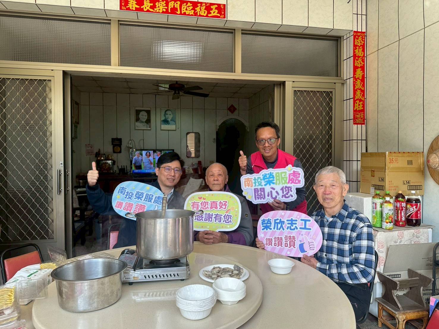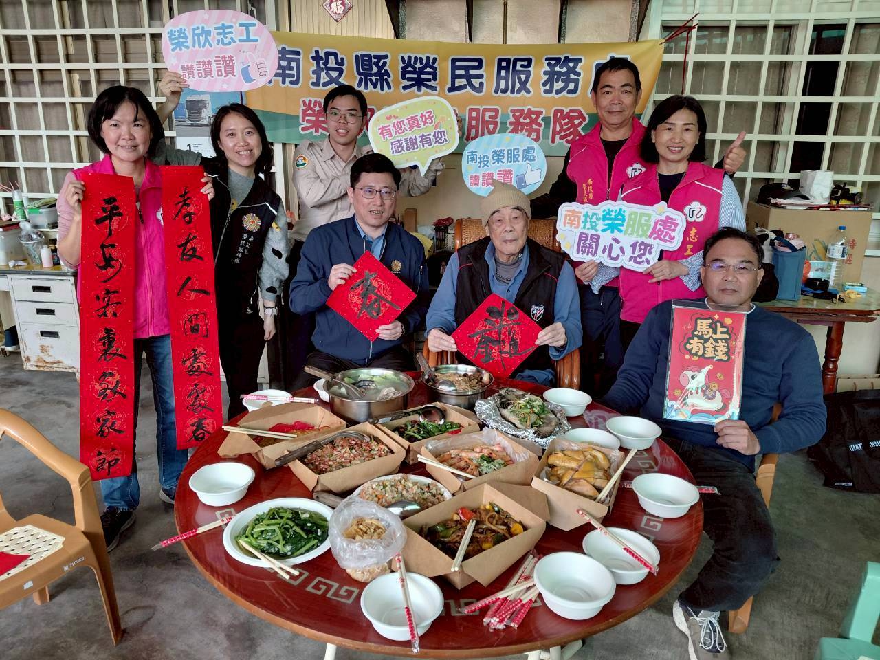 為迎接即將到來的農曆春節,南投縣榮民服務處共規劃辦理四場次為榮民眷清理環境、除舊佈新暨圍爐賀新春活動。由該處王怡文處長及同仁分別偕榮欣志工夥伴們到南投市、鹿谷鄉、國姓鄉及仁愛鄉等地區,協助高齡榮民長輩們整理家中環境,除舊佈新、貼春聯,並準備美味佳餚陪同圍爐用餐。志工伙伴們服務熱誠的暖意,讓榮民長輩們提前感受年節氣氛、喜迎馬年。 榮服處同仁及榮欣志工們帶著打掃用具,先後來到百歲人瑞陳伯伯、朱伯伯及高齡雙老同住的黃伯伯等榮民家中,紛紛挽起衣袖、戴起口罩及手套,開始協助長輩們清掃家中環境、收拾雜物及垃圾;整理工作告一段落後,便在門楣處貼上由志工親自揮毫的應景春聯。長輩們看著整潔的環境及喜氣洋洋的春聯,不禁展露出喜悅的笑容。 打掃結束,接著就是溫馨的圍爐時刻。本次圍爐由榮欣志工親自料理烹煮食材,將年節應景料理佛跳牆、富貴豬腳、暖胃雞湯及象徵好彩頭的菜頭粿等數道美味菜餚擺上桌,與長輩們共享佳餚,長輩們對榮服處以實際行動關懷及榮欣志工的服務熱情,頻頻表達感謝之意,在榮服處同仁與榮欣志工的陪伴下,提前感受到年節的團圓氛圍。 王處長感性的表示,她預於2月1日調任台中市榮服處。離別前夕,特別偕同接任的李毓錫處長與各級服務幹部、榮欣志工來陪長輩圍爐,並藉此機會將後續關懷服務的工作交接給李處長,相信李處長會秉持「為善最樂」的精神,推動服務照顧工作,也請各位長輩繼續給予支持及鼓勵。此次,藉著辦理圍爐共餐活動,陪長輩們重溫天倫之樂,並拜早年,祝福長輩們在馬年行大運、喜樂安康。 相關照片