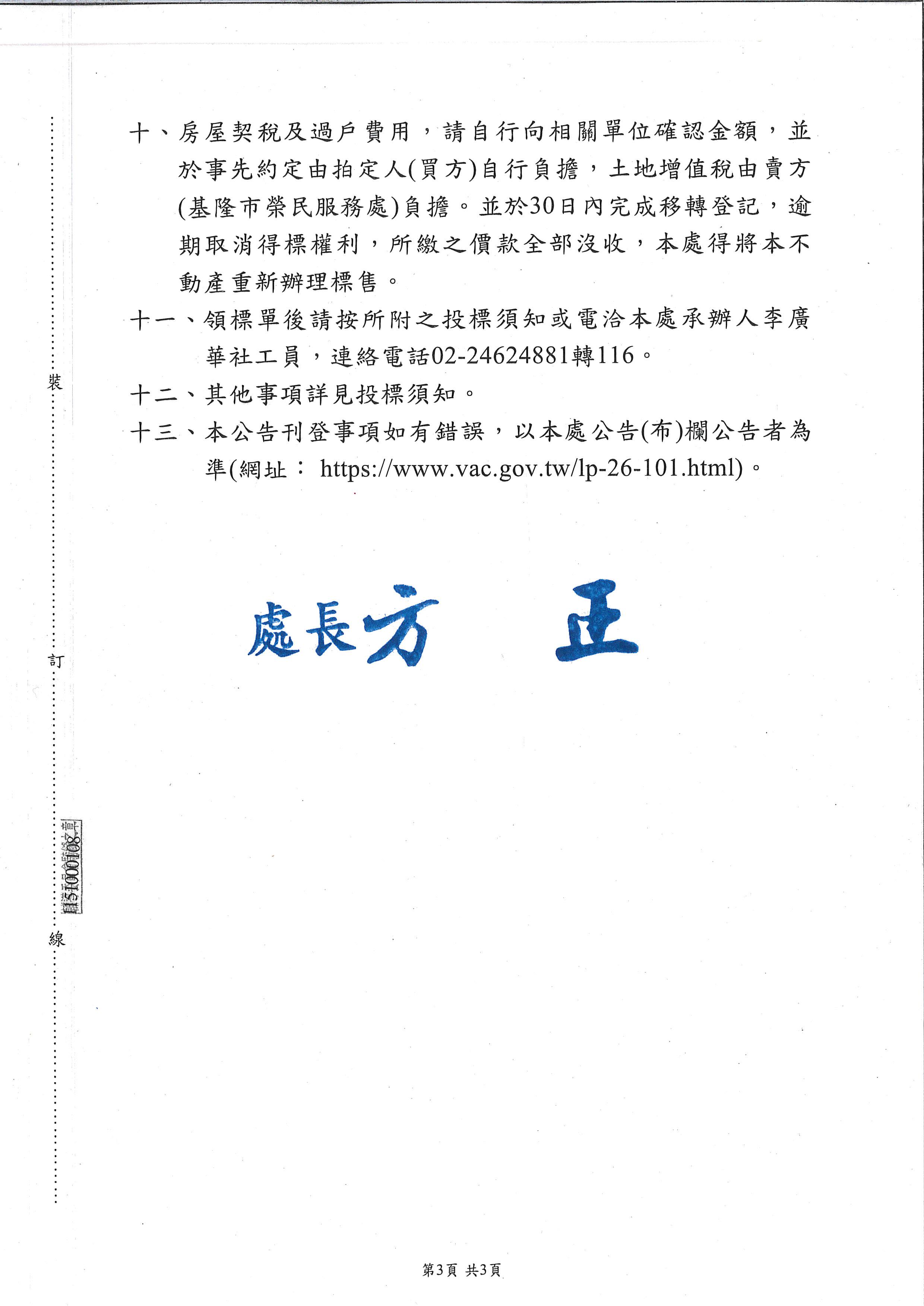 發布日期:115-01-21 資料來源:基隆市榮民服務處 115年第1次公開標售代管單身亡故榮民不動產公告 相關照片 115年第1次公開標售代管單身亡故榮民不動產公告 115年第1次公開標售代管單身亡故榮民不動產公告 115年第1次公開標售代管單身亡故榮民不動產公告 附件下載 檔案名稱 更新日期 下載次數 115年第1次公開標售代管單身亡故榮民不動產公告.pdf 115-01-21 68