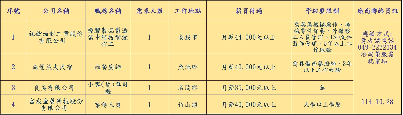 【南投榮服處】廠商職缺表(114.10.28)