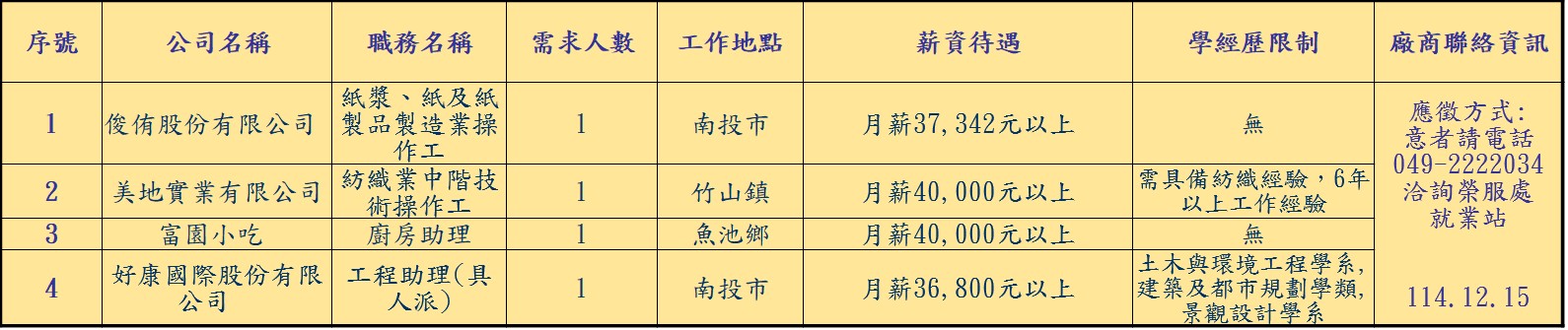 【南投榮服處】廠商職缺表(114.12.15)