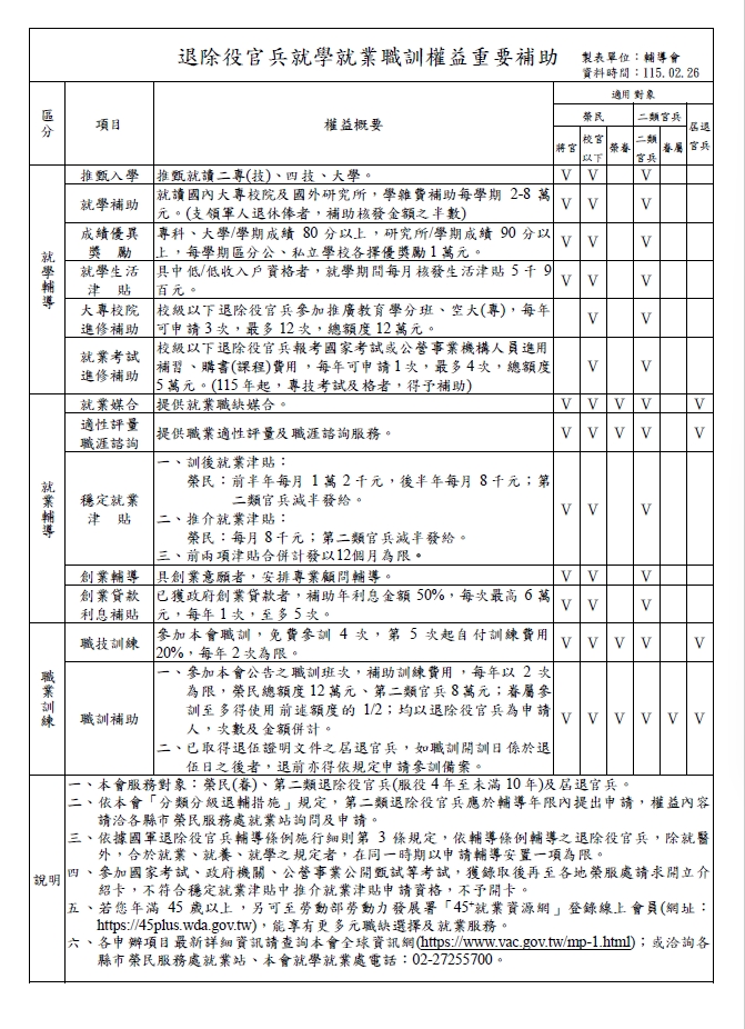 「退除役官兵就學就業職訓權益重要補助(權益簡表)」(資料時間115.02.26)(發文版).pdf