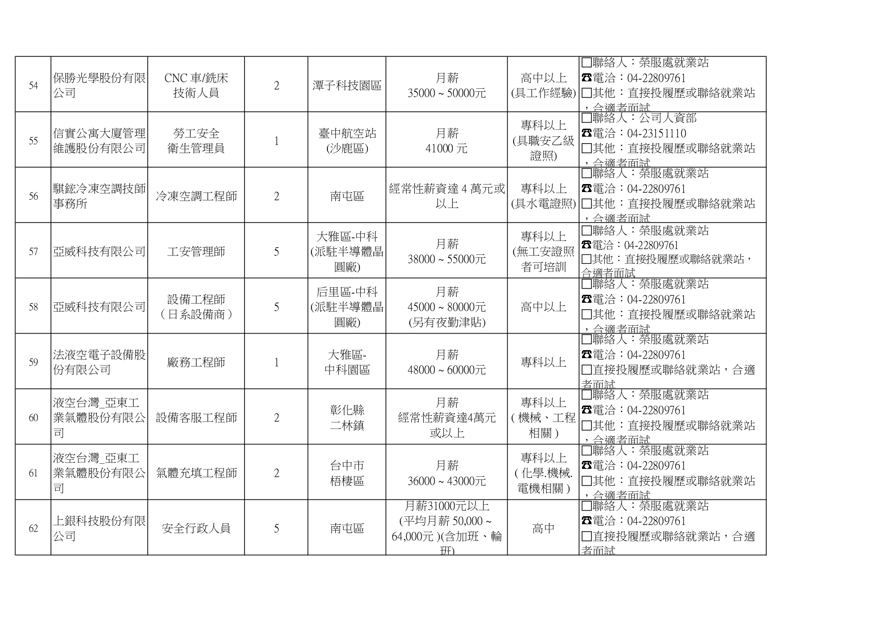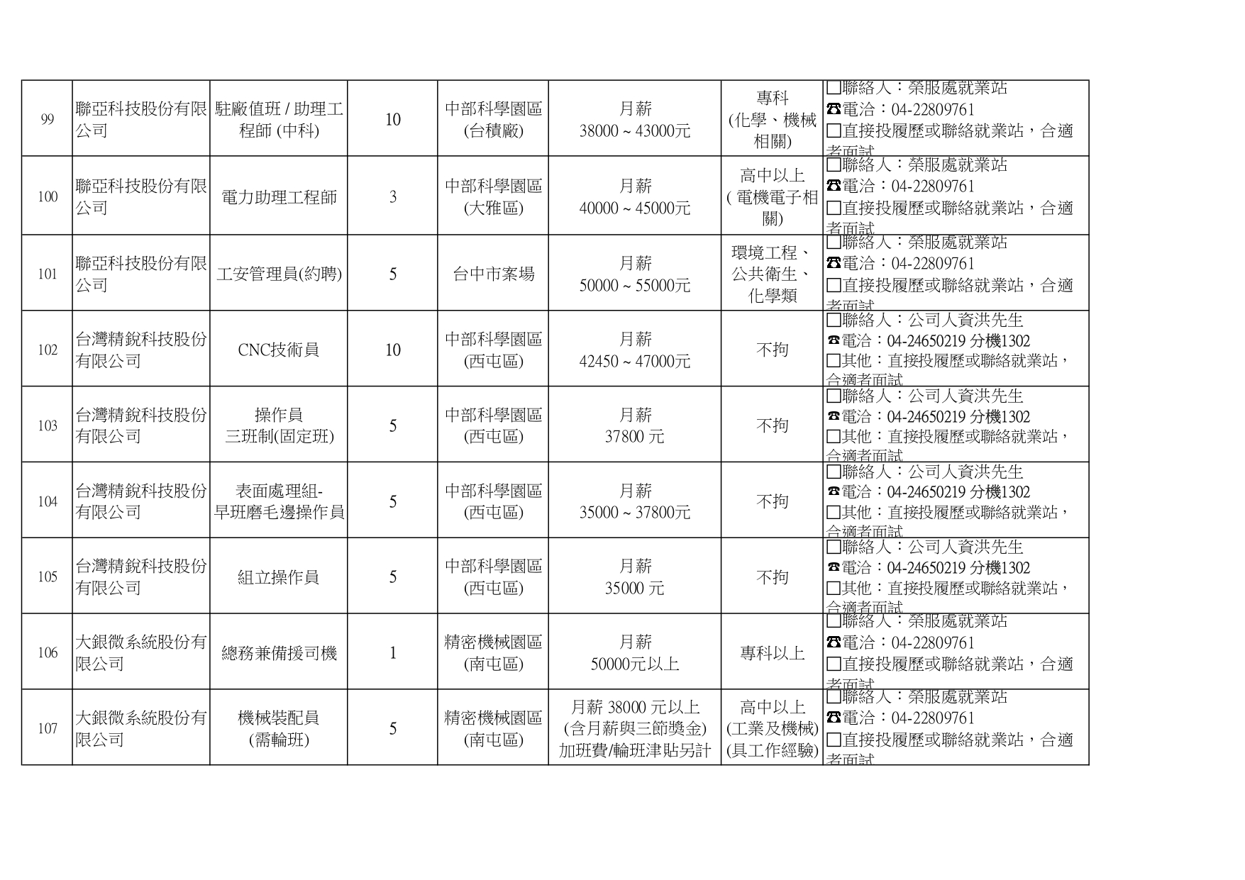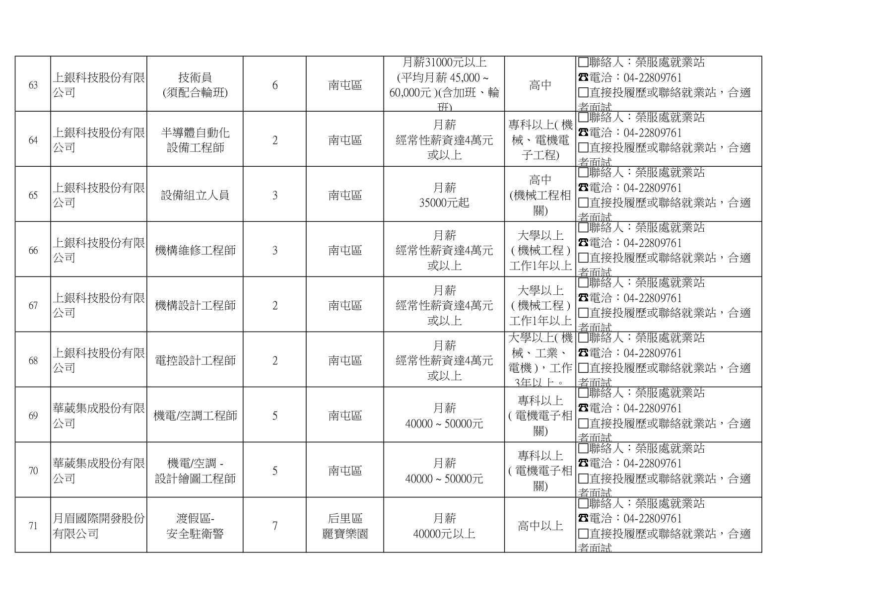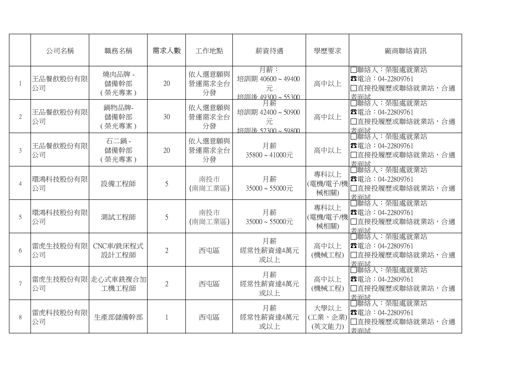 臺中市榮民服務處就業巿場快報(115. 04.22 最新廠商職缺表)