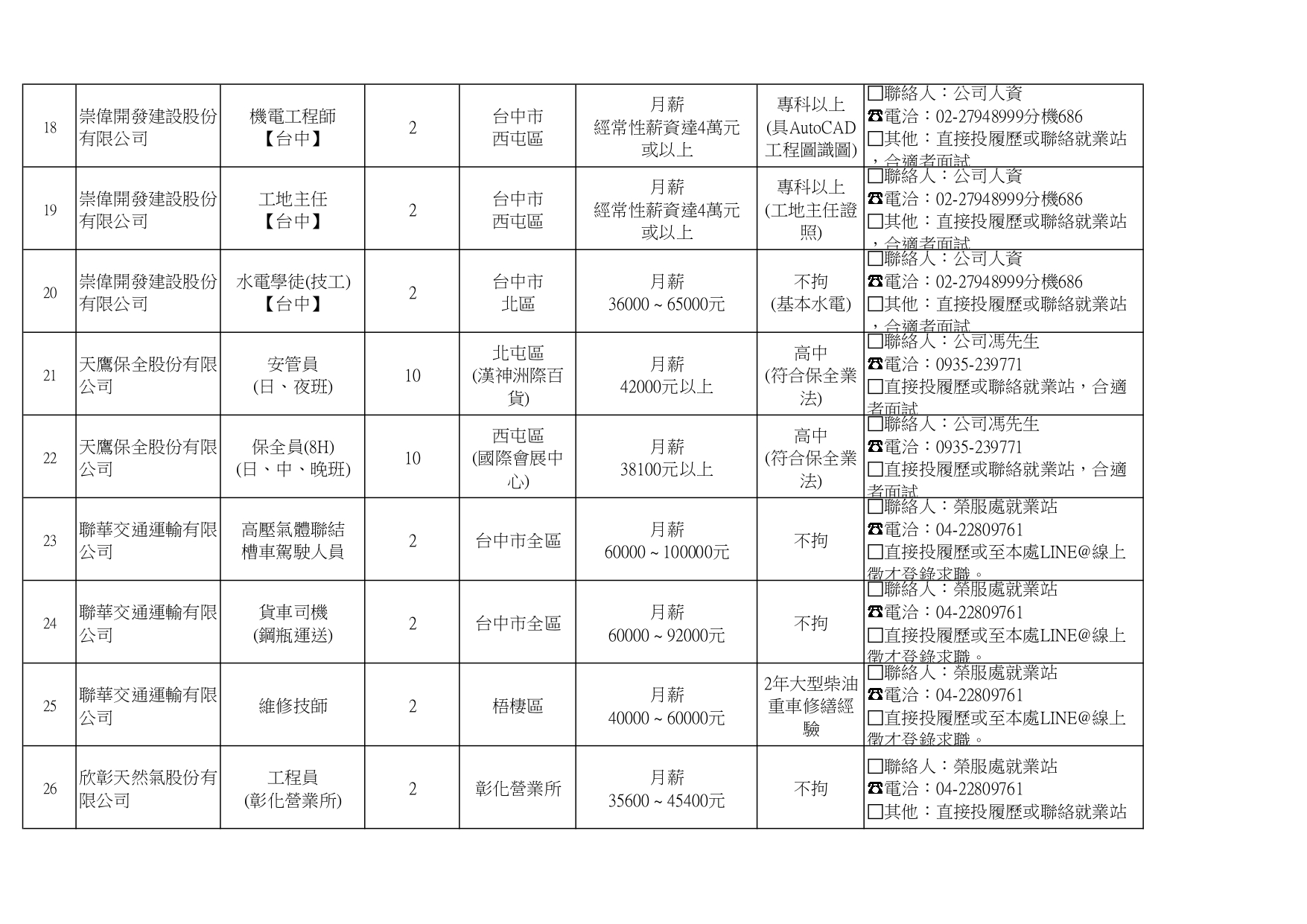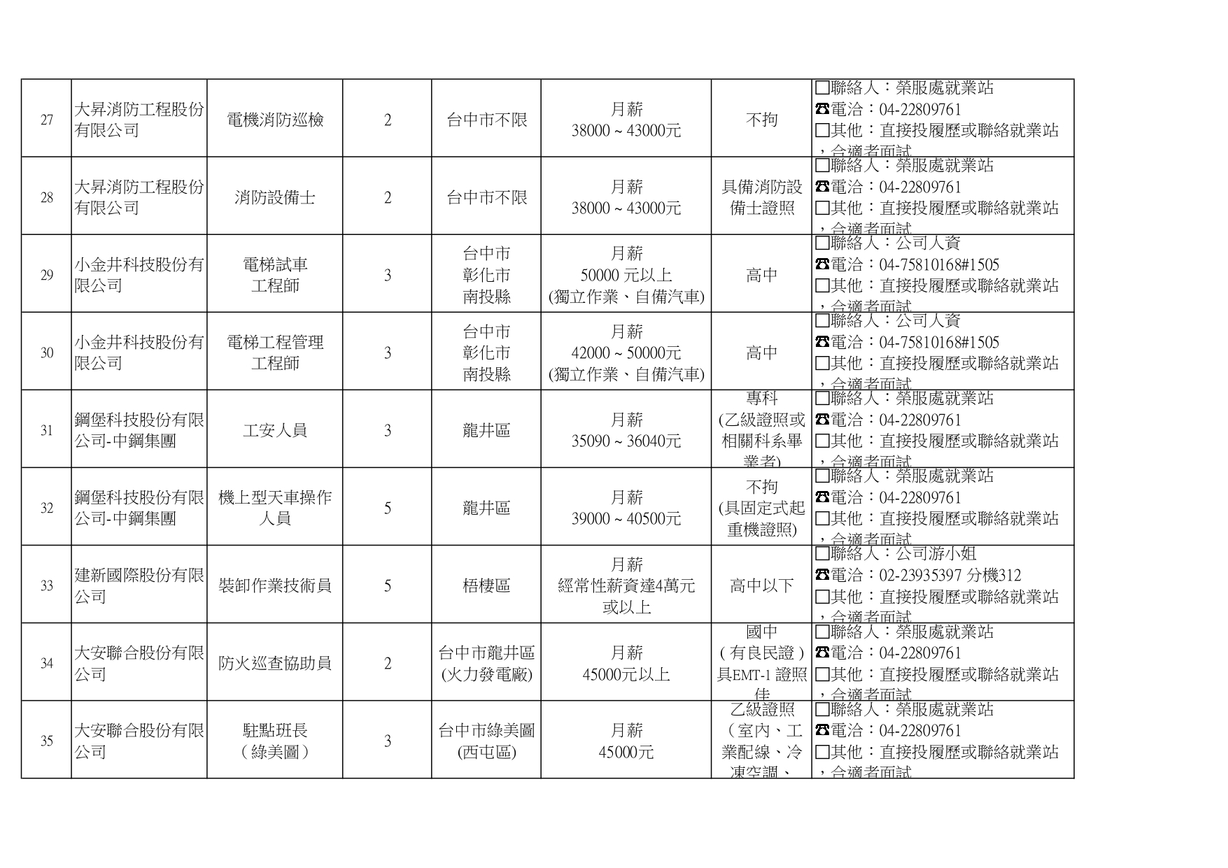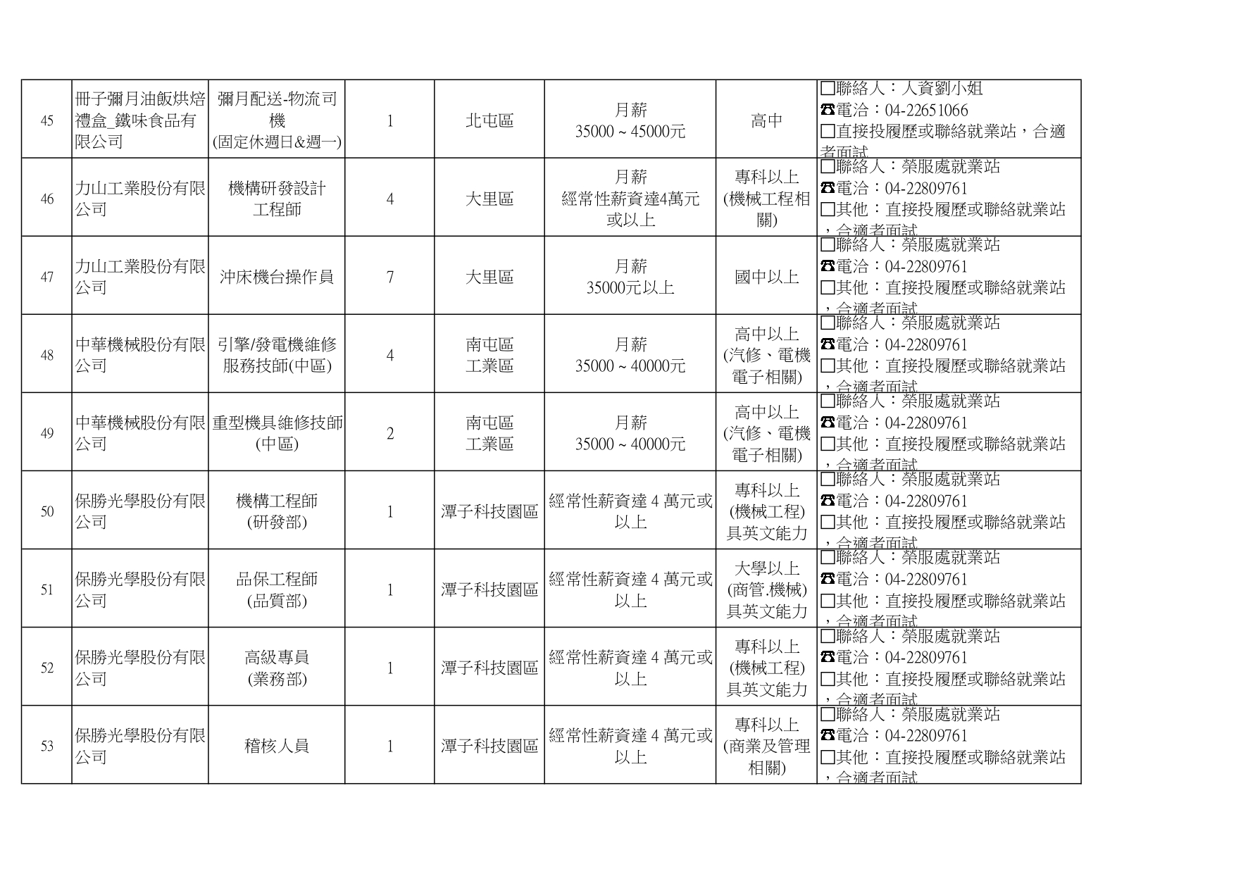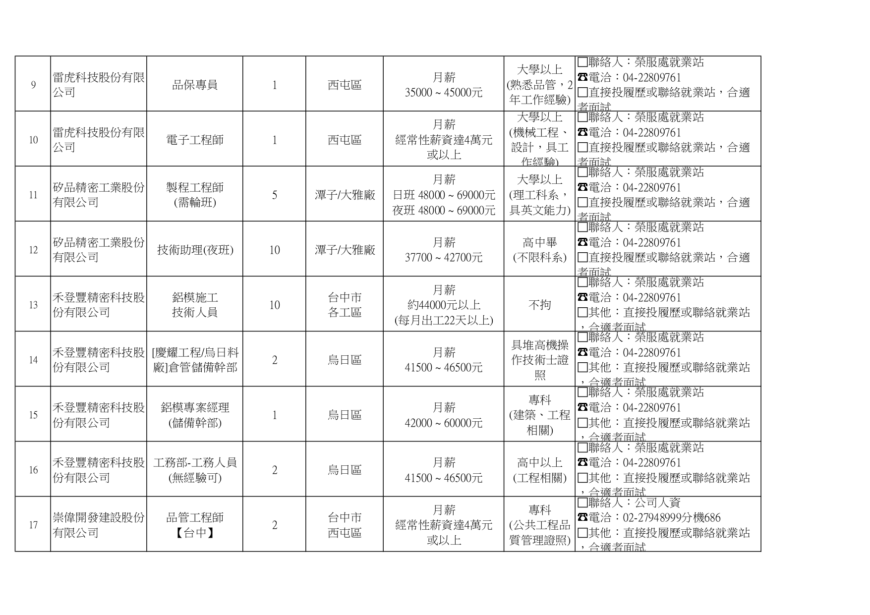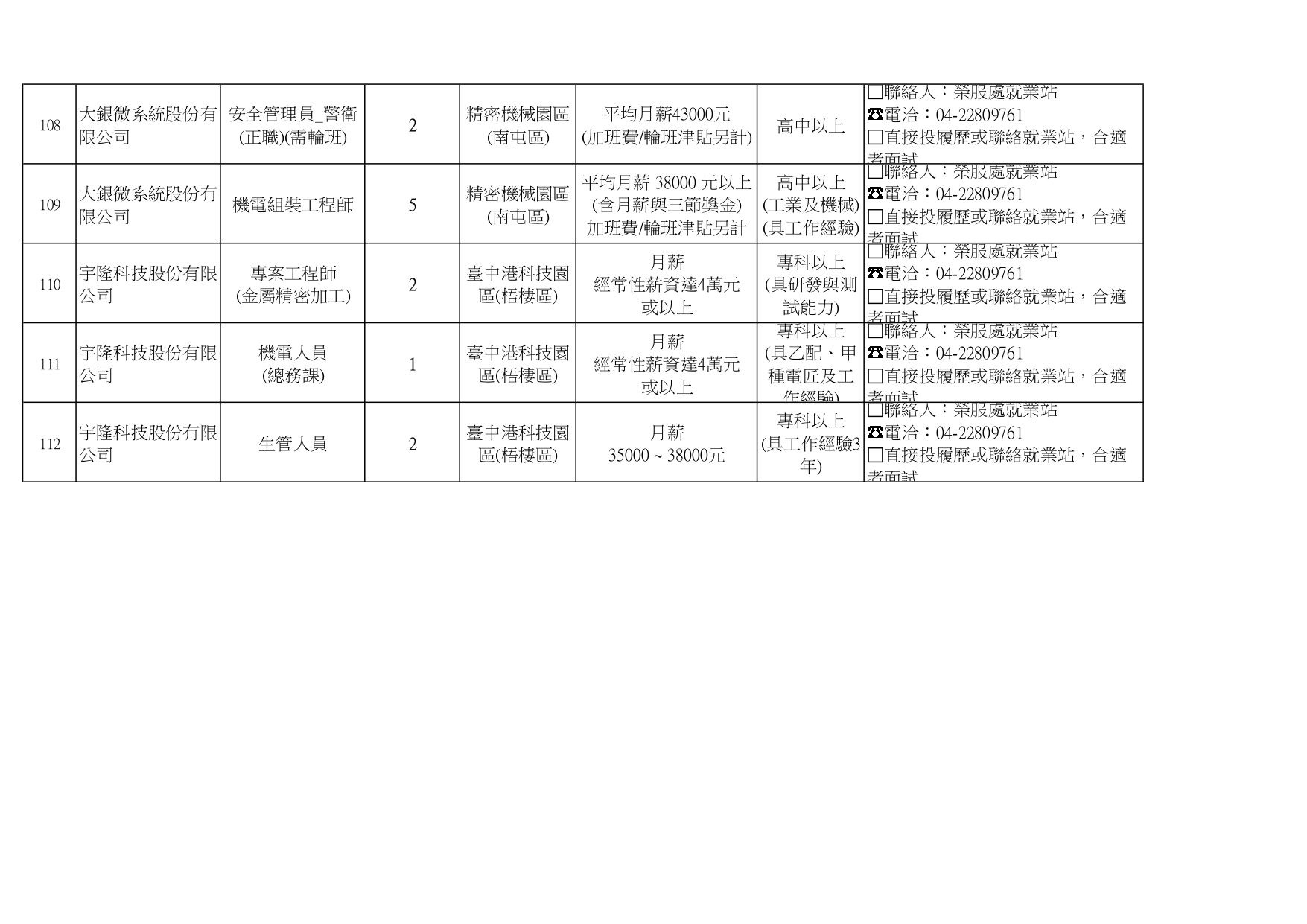 臺中市榮民服務處就業巿場快報(115. 04.22 最新廠商職缺表)