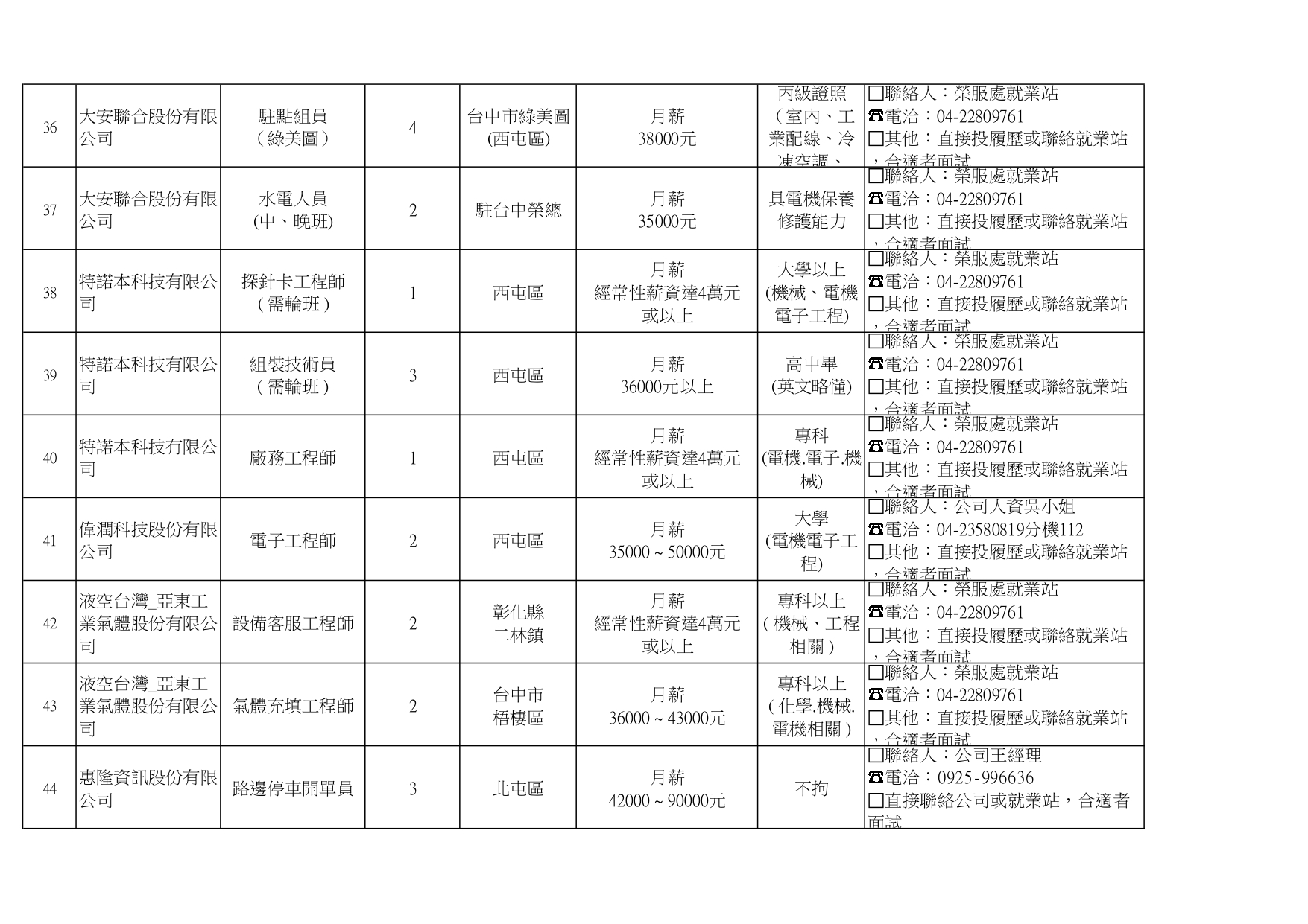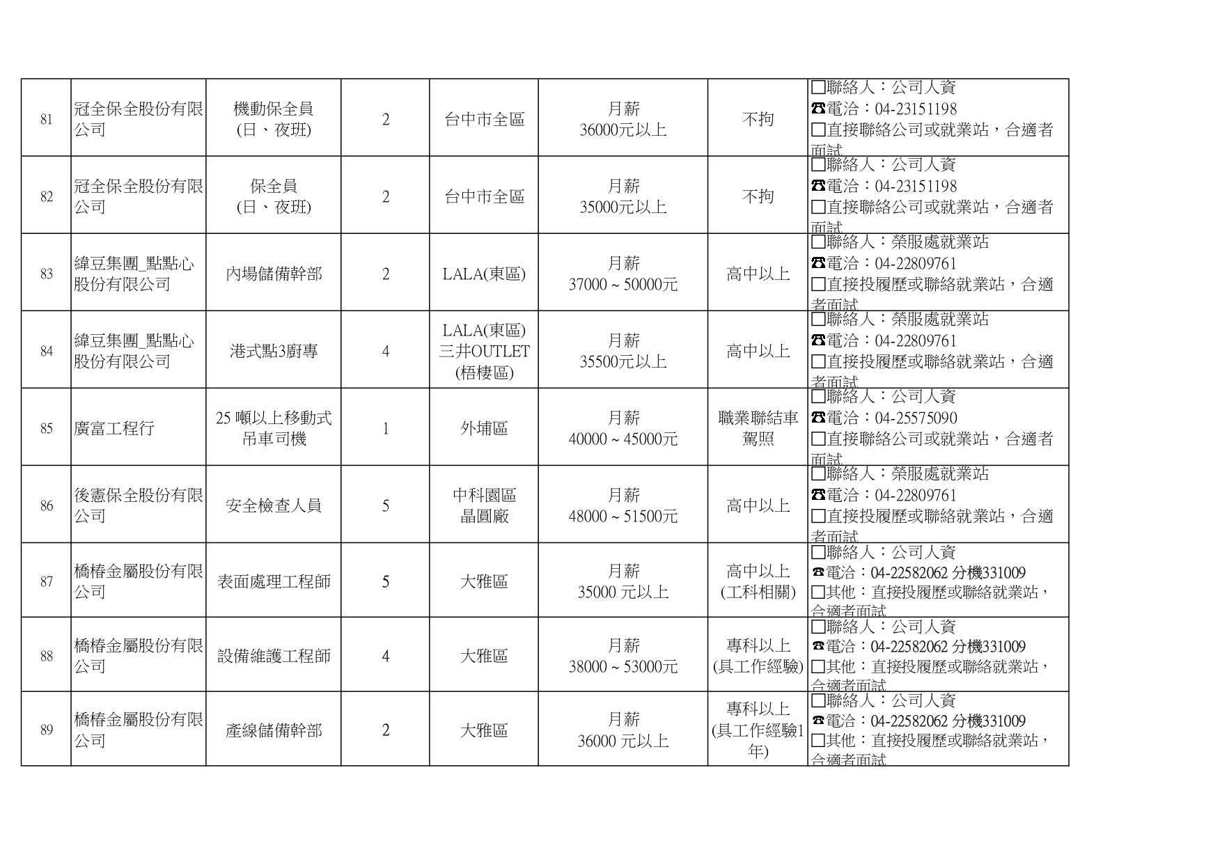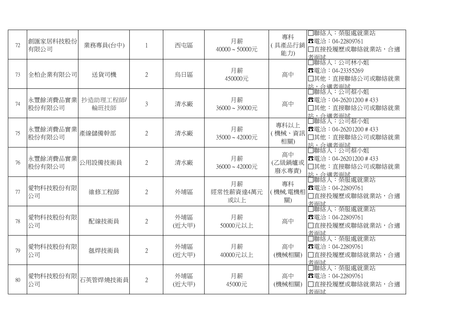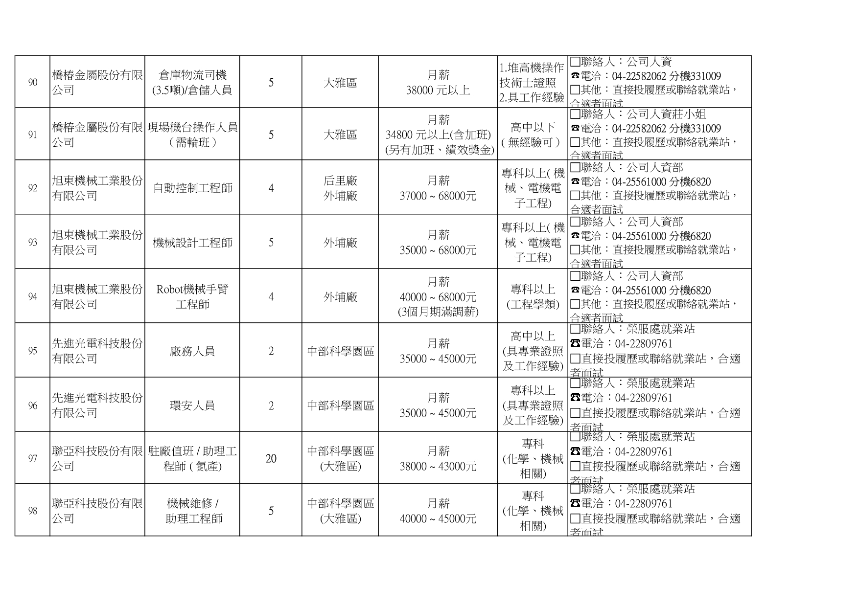 臺中市榮民服務處就業巿場快報(115. 04.22 最新廠商職缺表)