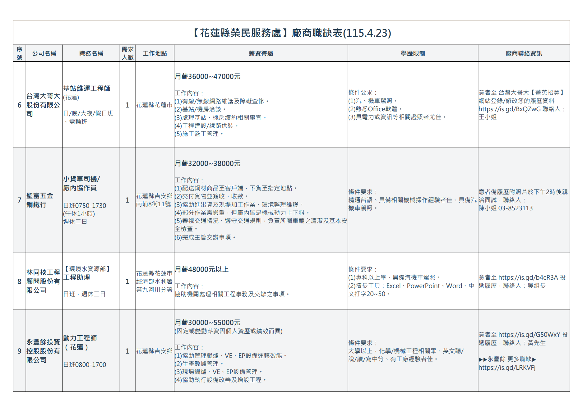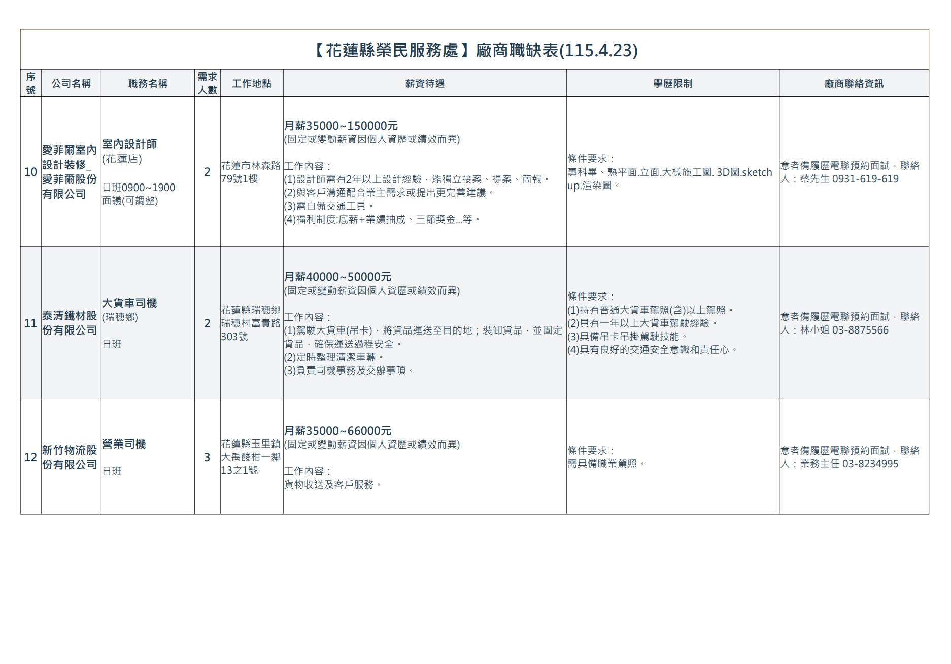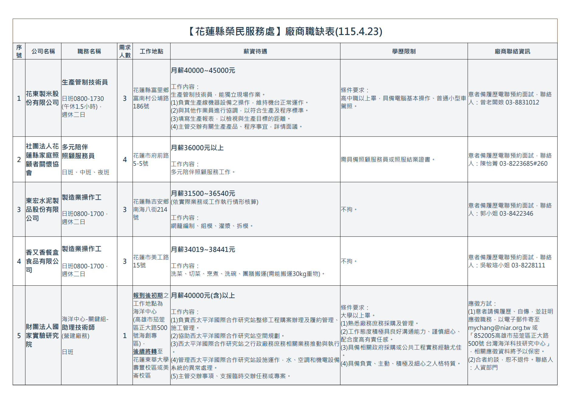 | 【花蓮縣榮民服務處】廠商職缺表(115.4.23).pdf | 115-04-23 | 4 |