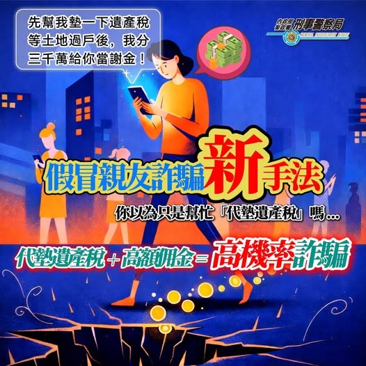 刑事警察局近期發現,詐騙集團鎖定「不動產繼承」議題,假冒多年未聯絡的親友,或自稱律師、代書,聲稱有「精華區遺產」等待繼承,只差稅金就能過戶,並以數百萬到上千萬元分紅作為誘餌,誘騙民眾借款! ※在正常情況下,處理遺產所需的稅費,應直接由「遺產總額」中扣除,或是由法定的「合法繼承人」自行繳納。 ~轉載165全民防騙網
