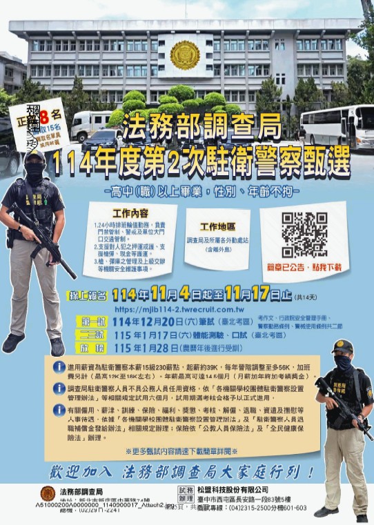 招考訊息~法務部調查局114年度第2次駐衛警察甄選考試