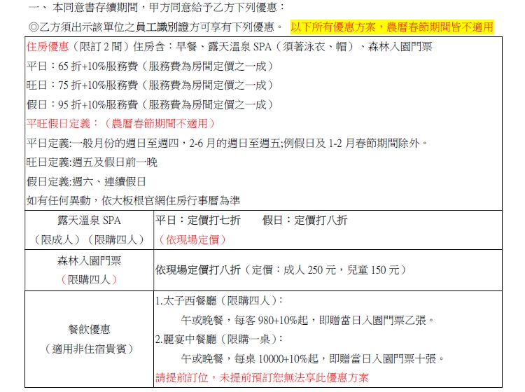 大板根森林溫泉酒店提供「榮民證」(含卡式及紙本)、「第二類退除役官兵權益卡」、「榮福卡」、「榮民遺眷家戶代表證」、「中華民國備除役軍人眷屬證」、「輔導會及所屬員工證識別」、「榮欣志工服務證」、「後備軍人輔導中心服務證」、「陸軍第一特種兵榮譽證」、「美國退伍軍人卡」,及「美國退伍軍人健保卡」之持卡人以下優惠: (一) 住房優惠(限訂2間)住房含:早餐、露天溫泉SPA(須著泳衣、帽)、森林入園門票。 1.平日:65折+10%服務費(服務費為房間定價之1成)。 2.旺日:75折+10%服務費(服務費為房間定價之1成)。 3.假日:95折+10%服務費(服務費為房間定價之1成)。 (二) 露天溫泉SPA:平日定價打7折,假日定價打8折。 (三) 森林入園門票:依現場定價(成人250元,兒童150元)打8折。 (四) 餐飲優惠: 1.太子西餐廳(限購4人):午或晚餐,每客980+10%起,即贈當日入園門票1張。 2.麗宴中餐廳(限購1桌):午或晚餐,每桌10000+10%起,即贈當日入園門票10張。 請事先於上班時間09:00-17:30以電話訂房(02-26749228),告知訂房人員使用榮民服務處特約方案。