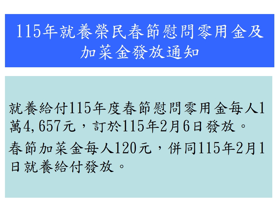 115年就養榮民春節慰問零用金及加菜金發放通知