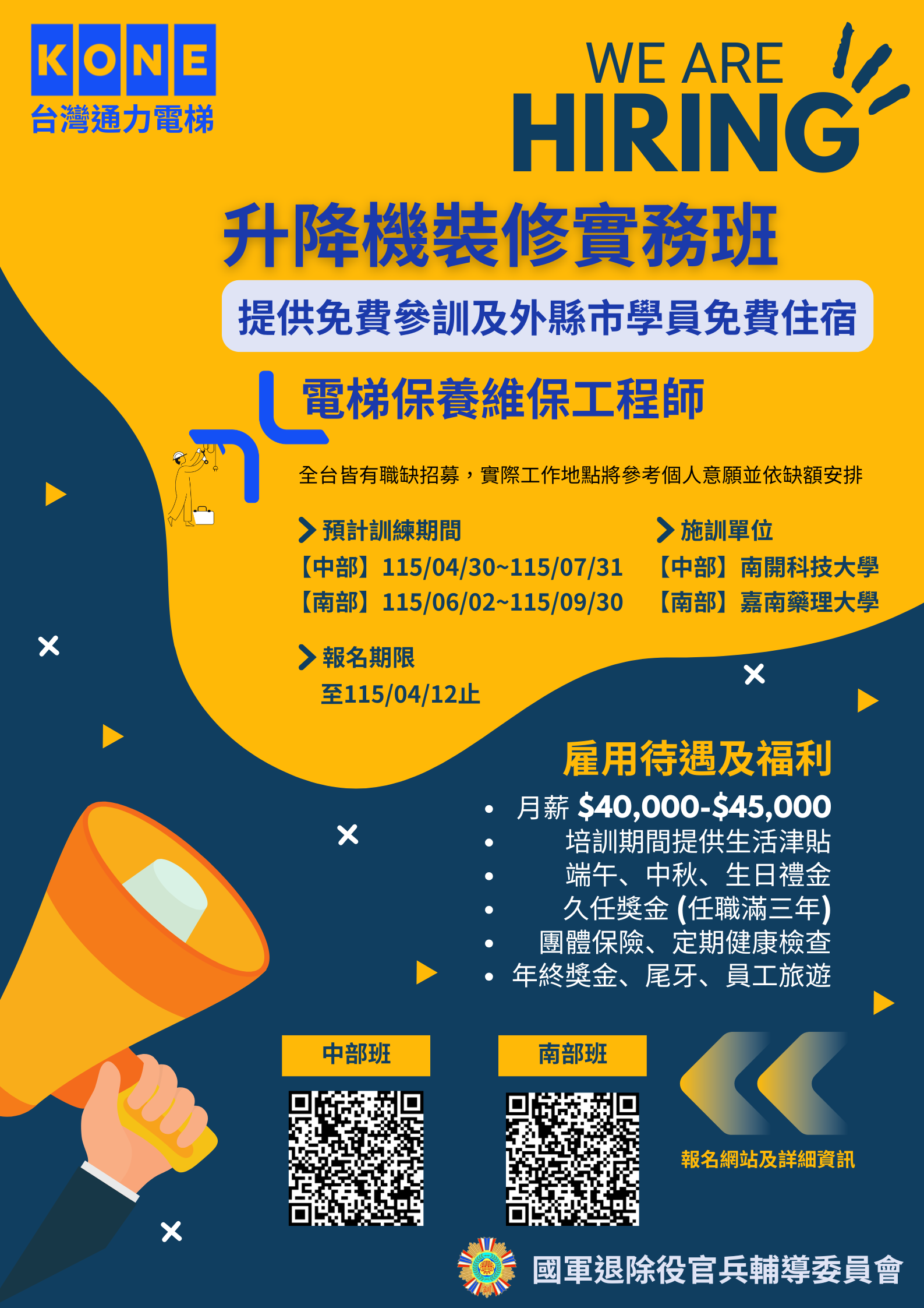 【委外招生資訊】 台灣通力電梯升降機裝修實務班 輔導會職訓中心委外班【升降機裝修實務班(中部)】日間班熱烈招生中,趕快來報名唷~~~!😊 🌟訓練地點:南投縣草屯鎮中正路568號 輔導會職訓中心委外班【升降機裝修實務班(南部)】日間班熱烈招生中,趕快來報名唷~~~!😁😁😁 ✅訓練地點:臺南市仁德區二仁路一段60號 報名相關資訊請詳看招生海報↓↓↓↓↓↓↓↓↓↓↓↓↓↓↓ ★報名網址:https://reurl.cc/GaVpgp,或掃描QR code報名。
