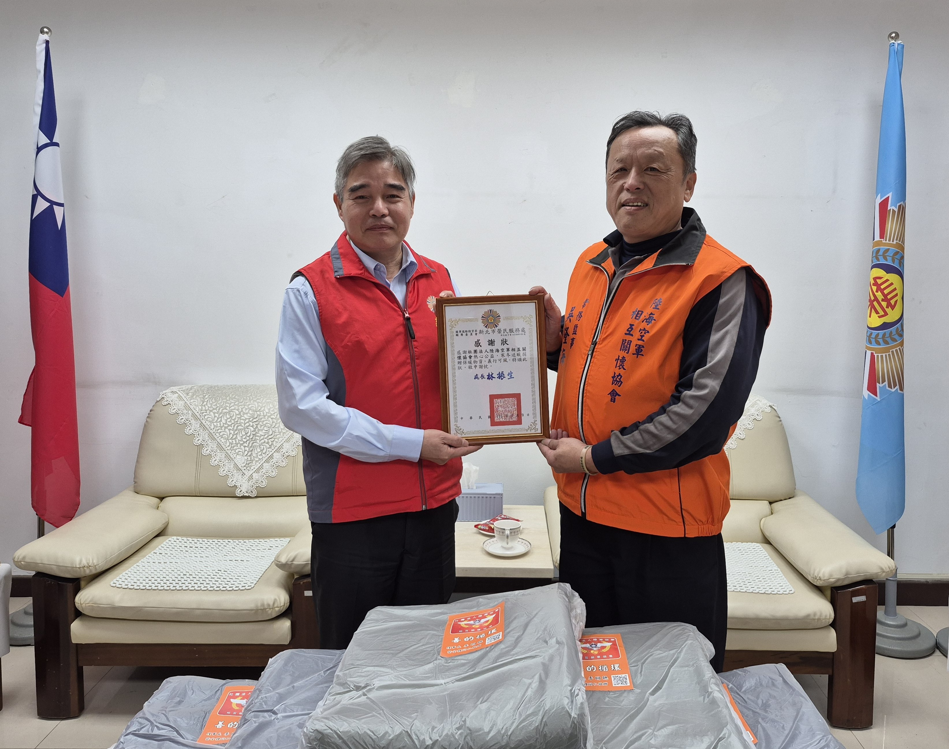 社團法人陸海空軍相互關懷協會寒冬送暖捐贈保暖物資溫暖榮民眷 - 國軍退除役官兵輔導委員會 新北市榮民服務處 入冬嚴寒,春節將至,為溫暖榮民(眷),社團法人陸海空軍相互關懷協會常務監事吳隆海、理事黃幸一及監事伊龍華於昨(9)日親赴新北榮服處送上保暖毛毯、毛帽及圍脖等物資,贈予轄區內之榮民(眷),望使長輩溫暖過冬。由處長林振生代表接受,並致贈感謝狀及禮盒向協會表達謝意。 陸海空軍相互關懷協會長期投身公益活動,過去曾捐贈白米給轄區內榮民(眷),此次捐贈活動,協會貼心考量氣候變化,及時送上實用保暖用品,盼減輕寒冬帶來的不適。常務監事吳隆海表示希望透過實際行動回饋社會,表達對榮民前輩的敬意與感謝。未來也將持續結合各界資源,推動更多關懷榮民及弱勢族群的公益活動。現場氣氛溫馨,充分展現彼此扶持的情誼。 林處長表示,新北市榮服處感謝陸海空軍相互關懷協會多年來對榮民眷的關懷與協助,為榮民家庭帶來溫暖;民間團體的支持不僅是物資上的援助,更帶來精神上的鼓舞,讓榮民(眷)感受到社會的溫暖與尊重。