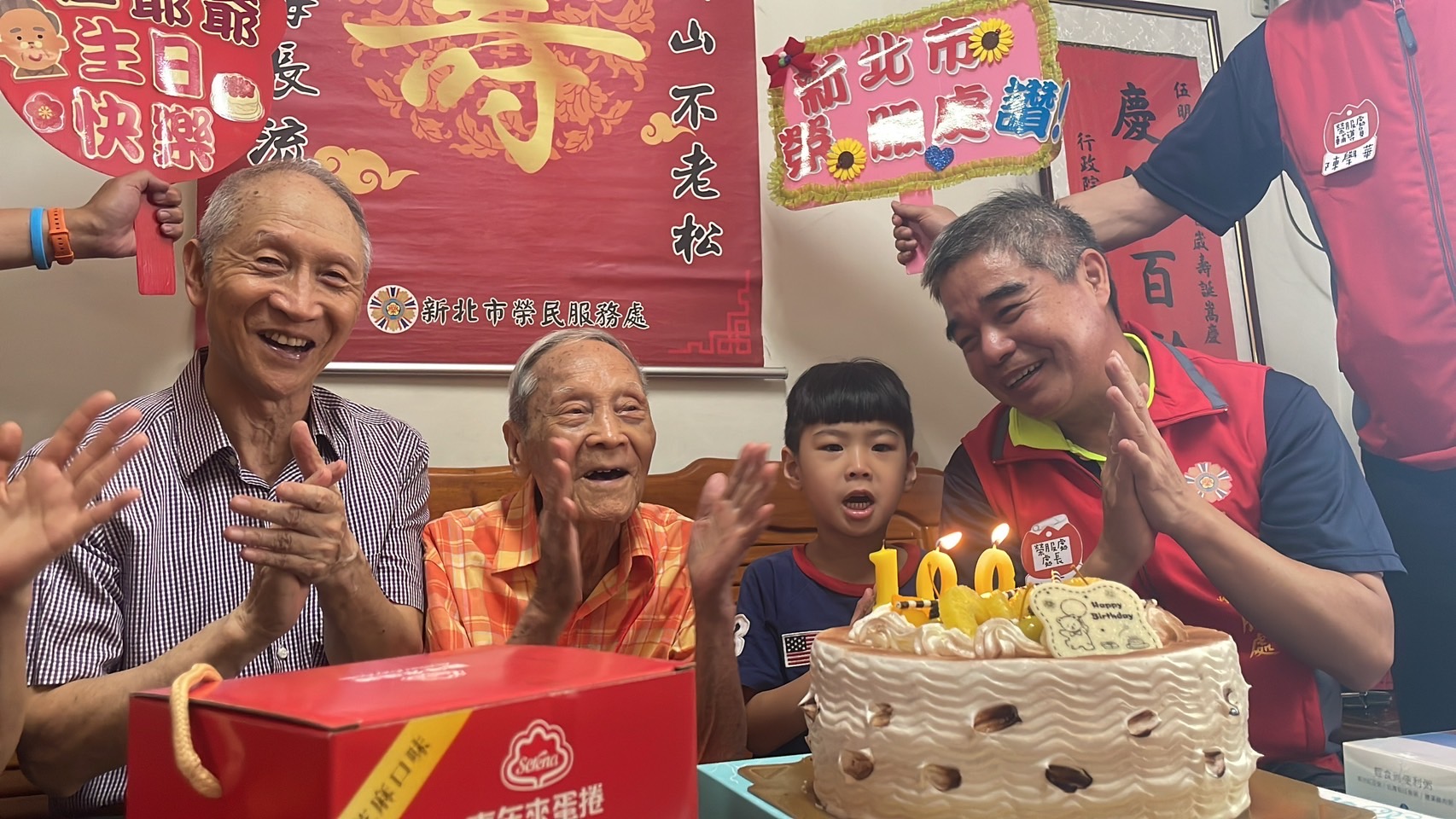 新北市榮服處林處長(右)與伍爺爺(左2)齊唱生日快樂歌,二公子及孫子左右陪伴在側。