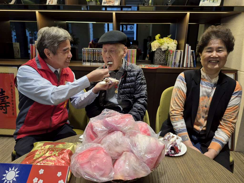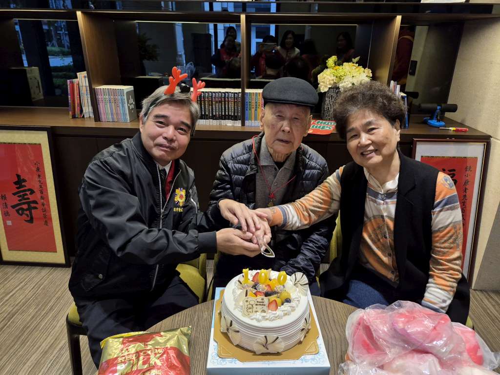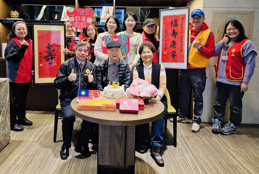 昨(7)日新北市新莊區百歲榮民饒小康爺爺喜迎百歲壽誕,新北市榮民服務處處長林振生率責任區輔導員、社區服務組長及華山基金會前往祝壽,致贈壽糕與營養品,並轉贈總統及行政院長祝賀壽屏,表達政府對百歲長者的誠摯祝福,現場氣氛溫馨感人。 饒爺爺出生於湖北,少年時期適逢國共內戰動盪年代,毅然投身軍旅,隨政府來臺後,任職陸軍通信署政治作戰部,以陸軍中校光榮退役,並獲頒勛獎章八枚,忠勤報國,貢獻良多。 退役後,饒爺爺仍積極進取,考取教師資格,於國中任教國文十九年,作育英才,深受師生敬重。饒爺爺雖年近百歲,仍精神奕奕,早年勤於羽球、籃球等運動,並陶冶於詩詞、書法與棋藝之中,培養良好體能素質,晚年作息規律、飲食均衡,身心保養得宜。 林振生處長表示,百歲慶生活動展現國家對榮民長者一生奉獻的高度肯定與關懷,榮服處將持續整合資源、精進服務,陪伴榮民長者安享尊嚴、幸福的晚年。 相關照片