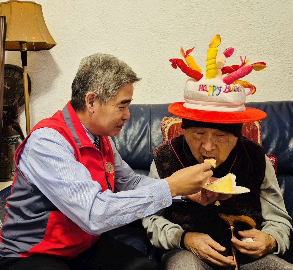 新北市榮民服務處處長林振生今(10)日率領責任區輔導員、社區服務組長及華山基金會等一行人,前往百歲榮民高祥茂爺爺家中舉辦溫馨祝壽活動。林處長代表轉贈總統、行政院長祝賀壽屏及賀禮,並親自為高爺爺配戴輔導會精心製作的金壽桃,向這位將一生精華歲月貢獻國家的世紀長者致上最崇高敬意。 高爺爺民國16年出生於四川,少年時投身軍旅。抗戰期間於民國34年在四川成都通過海軍船員考試,後分發至南京、上海一帶巡防,並憑藉優異表現逐步晉升為艦長。高爺爺回憶道,民國38年隨國軍艦隊由青島一路南下巡防,見證了動盪歲月中的海防點滴,最終抵達臺灣駐紮左營,自此在這片土地上落地生根。 談及養生秘訣,高爺爺笑稱自己生活規律、飲食清淡,且每日在家附近散步。今日與服務團隊互動時,爺爺依然口齒清晰、思緒敏捷,細細訴說著當年守衛海疆的時光,令在場人員感佩不已。 林振生處長表示,像高爺爺這樣一生投身海疆的英雄,是國家穩定厚實的力量。榮服處會延續這份守護的精神,竭盡所能提供最完善的服務,讓老前輩的晚年生活無後顧之憂。活動最後,大家齊聲歡唱生日快樂歌並分享祝壽蛋糕,在溫馨與祝福聲中圓滿結束。 相關照片