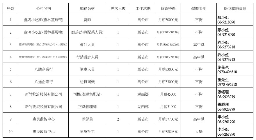 發布日期:115-04-14 資料來源:澎湖縣榮民服務處 【澎湖縣榮服處】廠商職缺表(115.04.13) 附件下載 檔案名稱 更新日期 下載次數 【澎湖縣榮服處】廠商職缺表(115.04.13).pdf 115-04-15 3