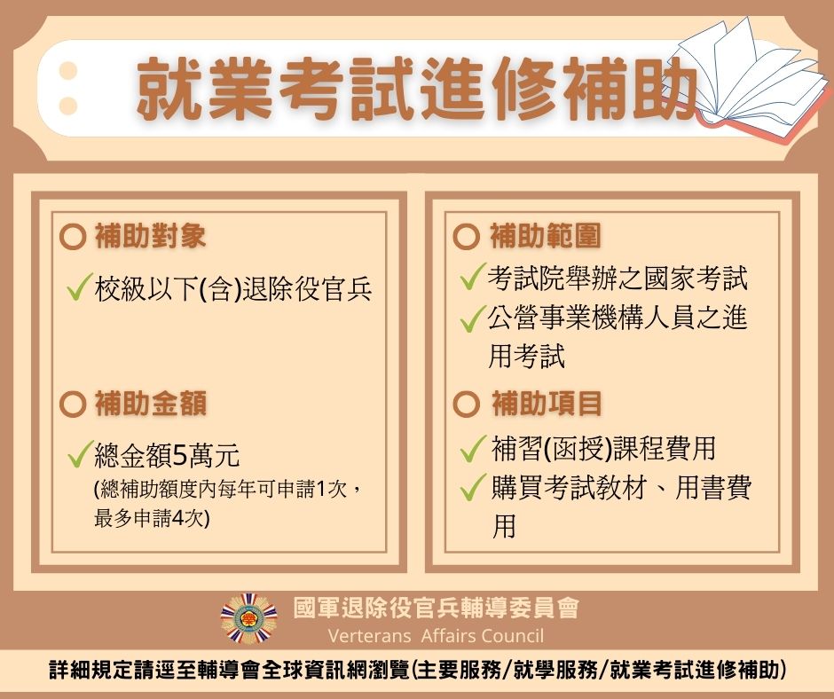 本會為鼓勵退除役官兵參加就業考試,期以順利就業安定生活,補助退除役官兵參加政府立案補習班進修課程費用或購買考試教材、用書費用,經實際報名參加國家考試或公營事業機構人員進用考試後3個月內,檢附繳費收據或發票正本、准考證影本(需註記全部到考)及存摺封面影本,向各縣市榮民服務處申請。