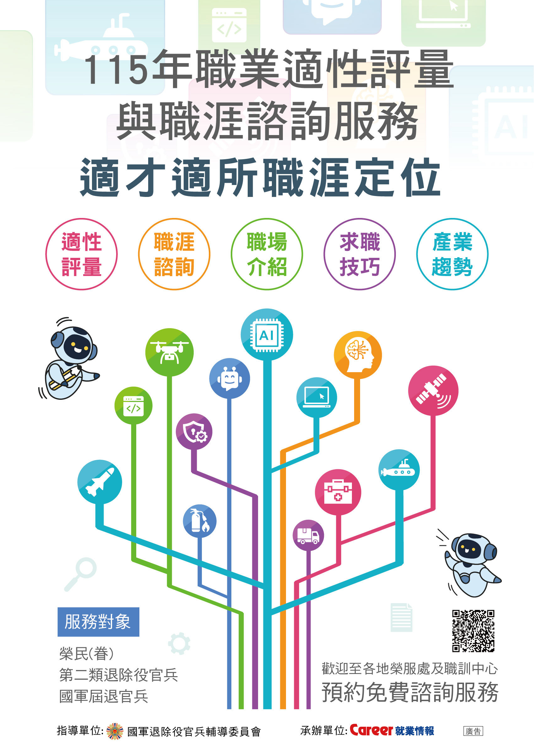 國軍退除役官兵輔導委員會提供免費「職業適性評量測驗」、「職涯諮詢」及「職涯講座」服務