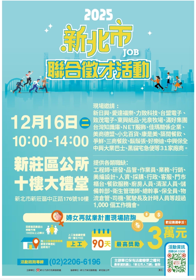 歡迎居住新莊及鄰近地區、有就業或轉職需求之榮民、眷屬及二類退除役官兵踴躍參加!
