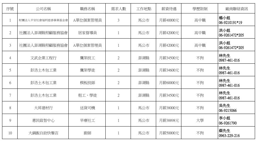 【澎湖縣榮服處】廠商職缺表(115.02.23)