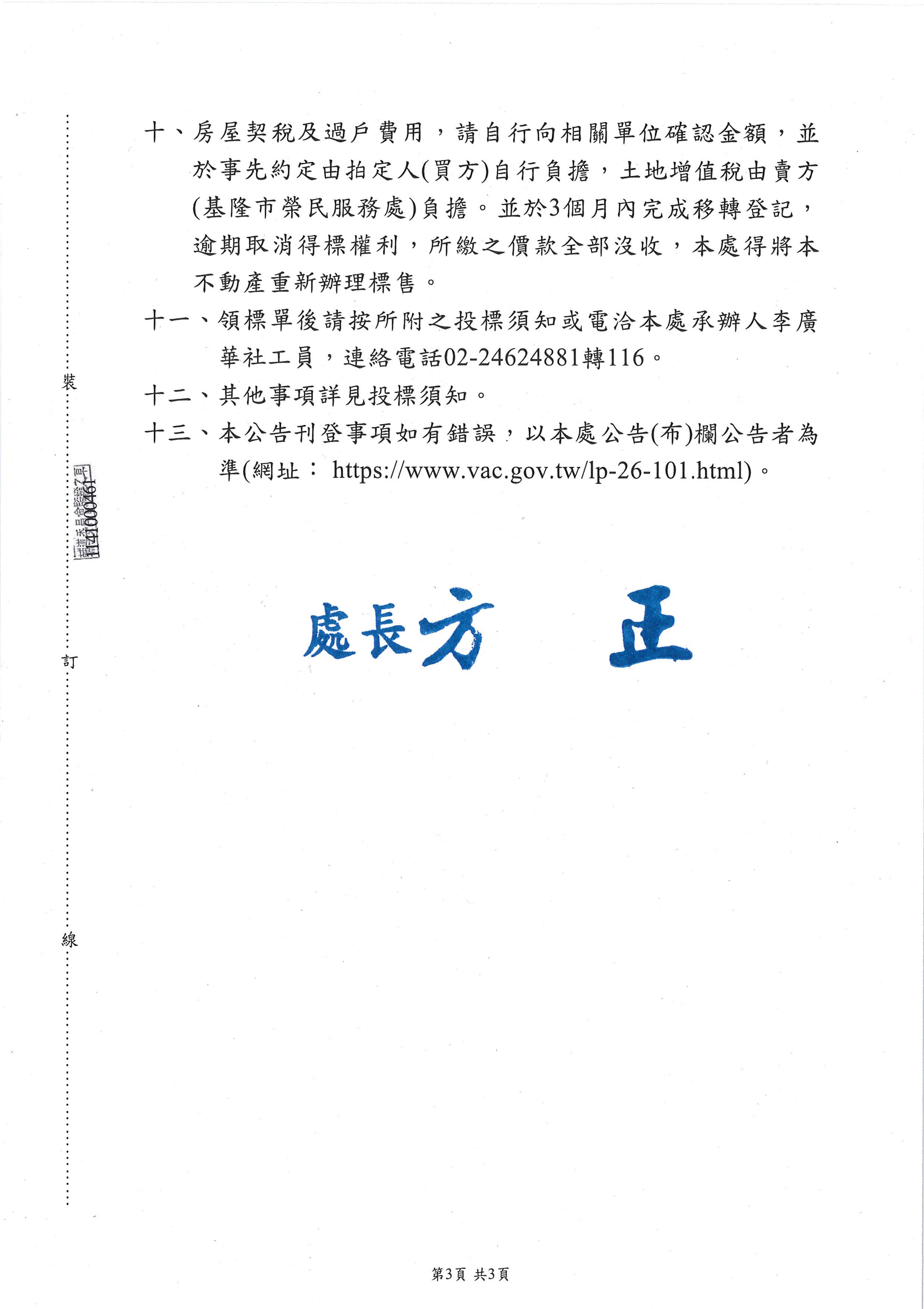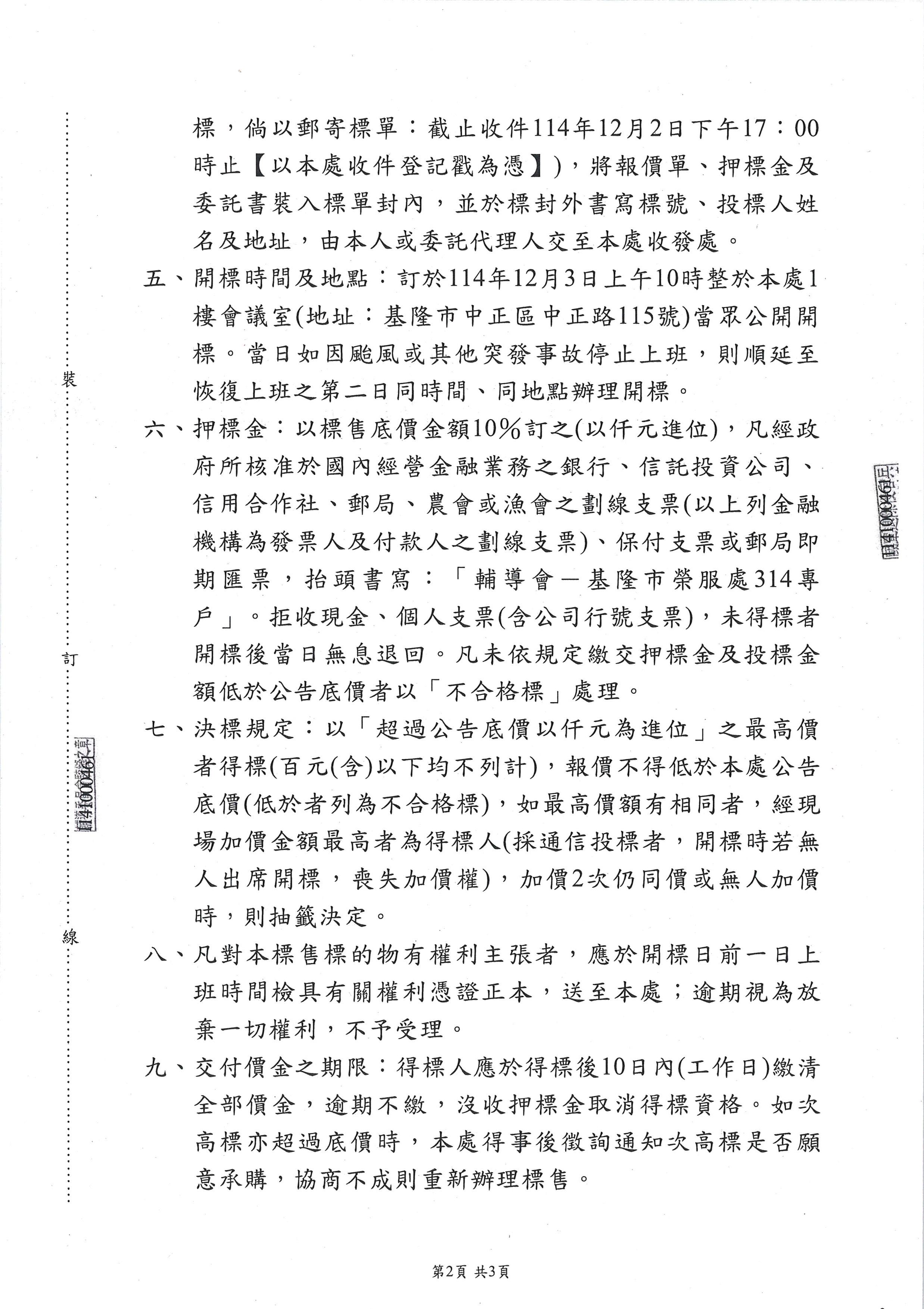發布日期:114-11-21 資料來源:基隆市榮民服務處 【基隆市榮民服務處】114年第1次公開標售代管單身亡故榮民不動產公告 相關照片 【基隆市榮民服務處】114年第1次公開標售代管單身亡故榮民不動產公告 【基隆市榮民服務處】114年第1次公開標售代管單身亡故榮民不動產公告 【基隆市榮民服務處】114年第1次公開標售代管單身亡故榮民不動產公告