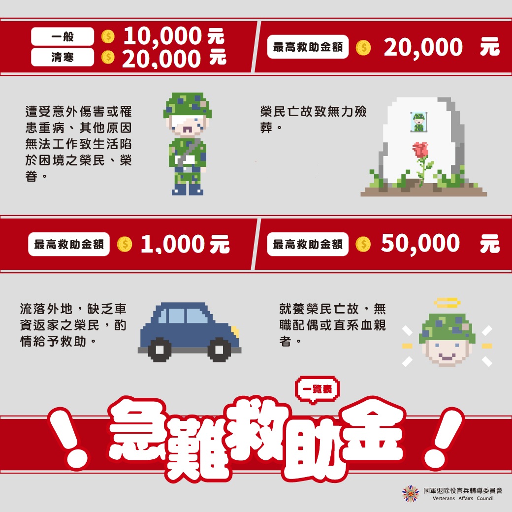 發布日期:114-11-19 發布單位:服務照顧處 急難救助圖卡一、符合下列情形之一,得申請救助: 1.遭受意外傷害致生活陷於困境者,如為低或中低收入戶榮民、榮眷及遺眷,最高救助金額為新臺幣二萬元;一般榮民、榮眷及遺眷,最高救助金額為新臺幣一萬元。 2.罹患重病、其他原因無法工作致生活陷入困境者,如為低或中低收入戶榮民、榮眷及遺眷,最高救助金額為新臺幣二萬元;一般榮民、榮眷及遺眷,最高救助金額為新臺幣一萬元。 二、洽辦單位: 電話及臨櫃諮詢:請洽各榮民服務處。