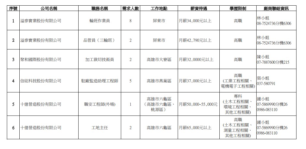 發布日期:114-10-09 資料來源:屏東縣榮民服務處 屏東縣榮服處廠商職缺表(114.10.09) 附件下載 檔案名稱 更新日期 下載次數 屏東縣榮服處廠商職缺表(114.10.09).pdf 114-10-09 9