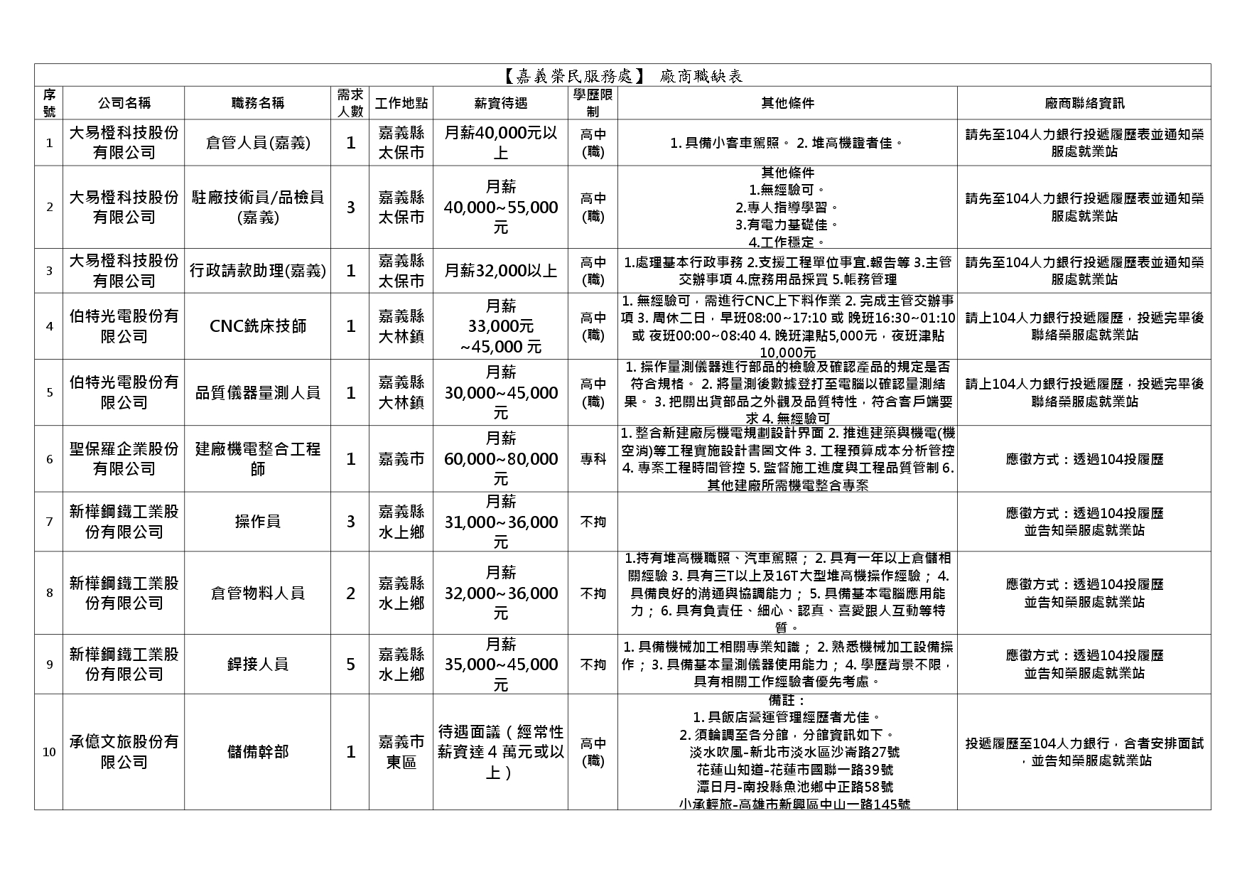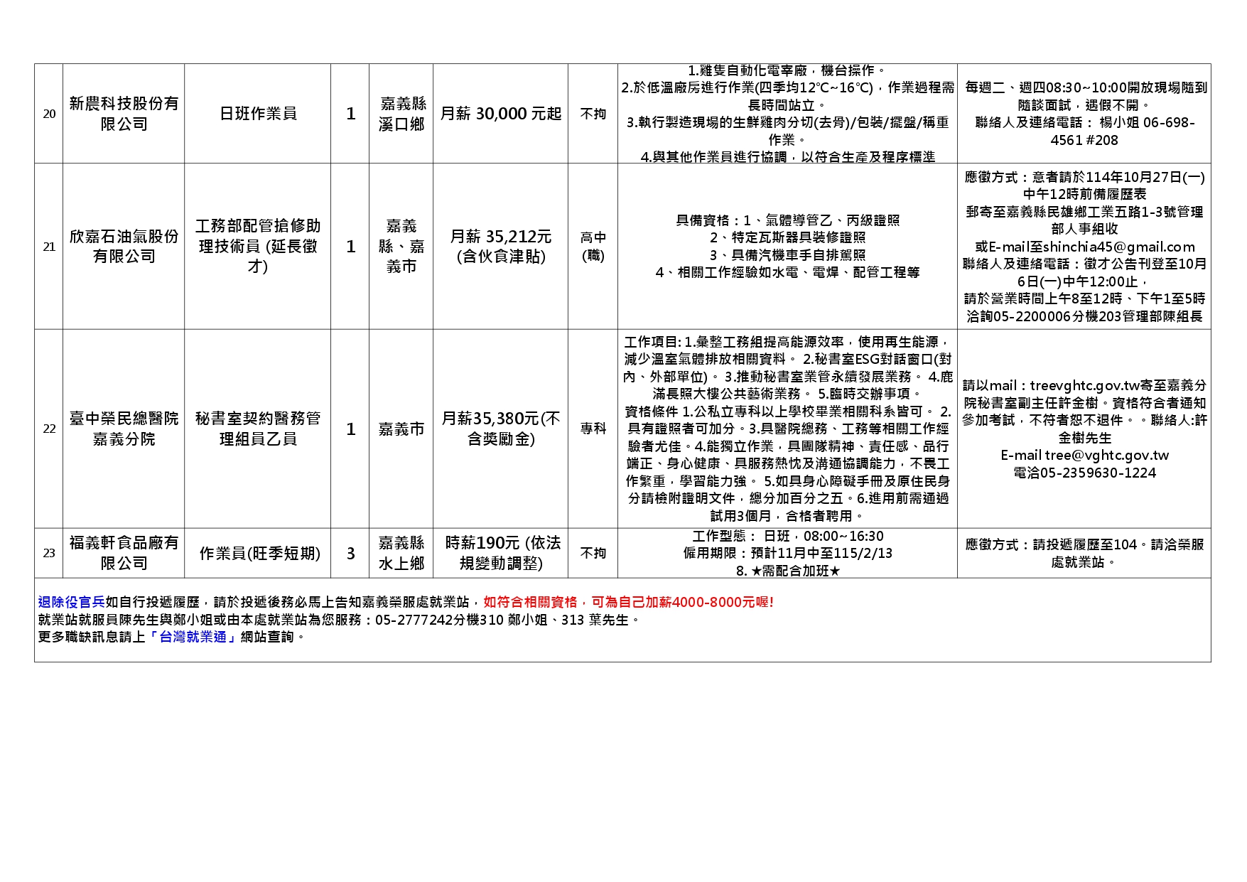 【嘉義榮服處】廠商職缺表(114.10.09).pdf | 114-10-09 | 11 |