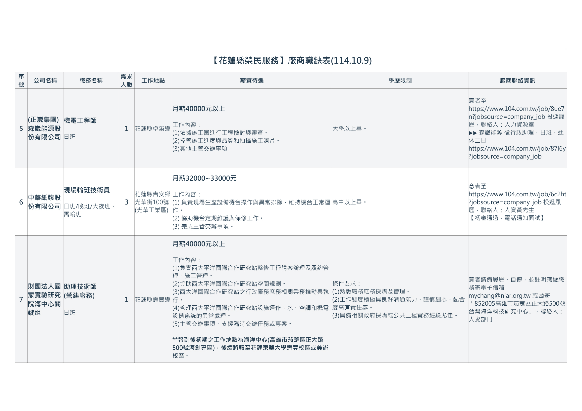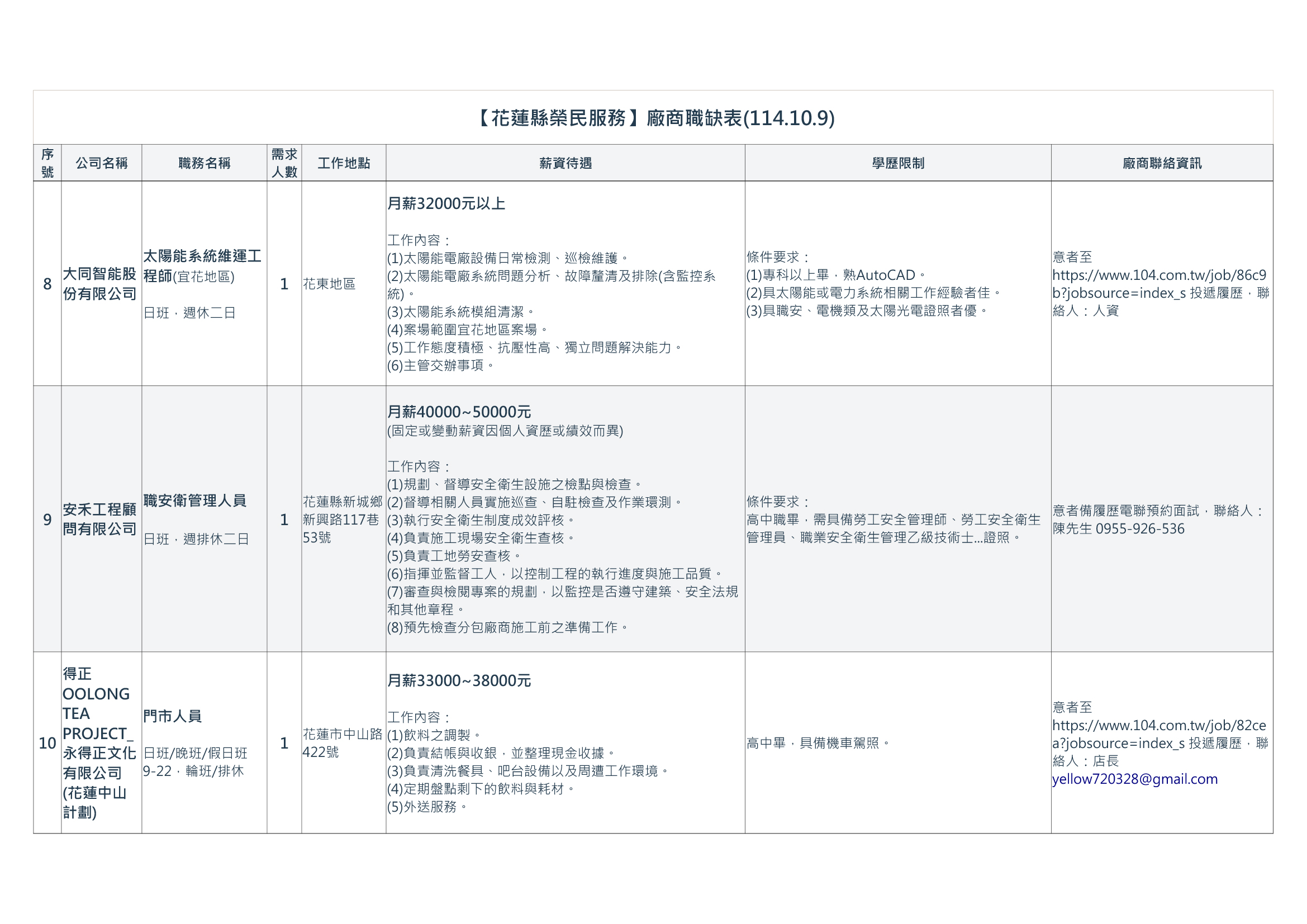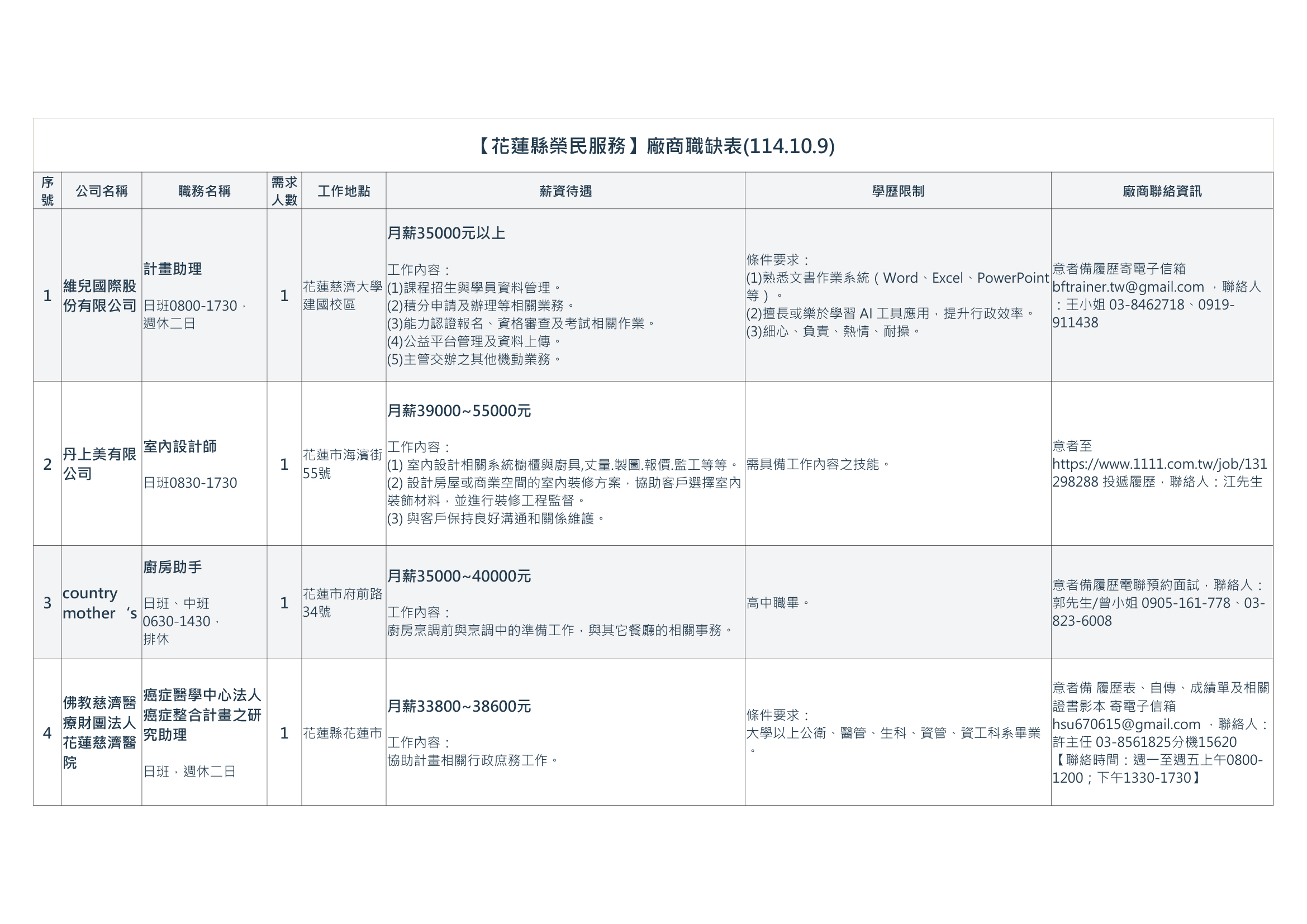 【花蓮縣榮民服務處】廠商職缺表(114.10.9).pdf | 114-10-09 | 10 |