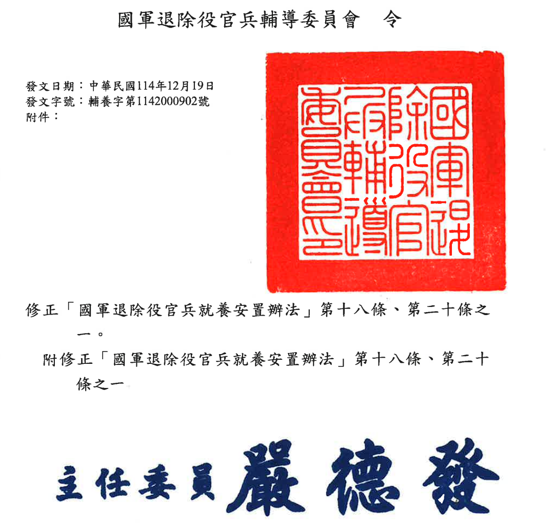 輔導會修正「國軍退除役官兵就養安置辦法」第十八條、二十條之一