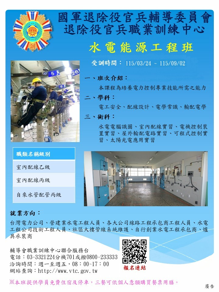 【輔導會職訓中心招生訊息】 📣📣輔導會職訓中心加開自辦「115年度水電能源工程班」(日間養成班) ⭐️報名期間:115/01/09 ~ 115/02/22