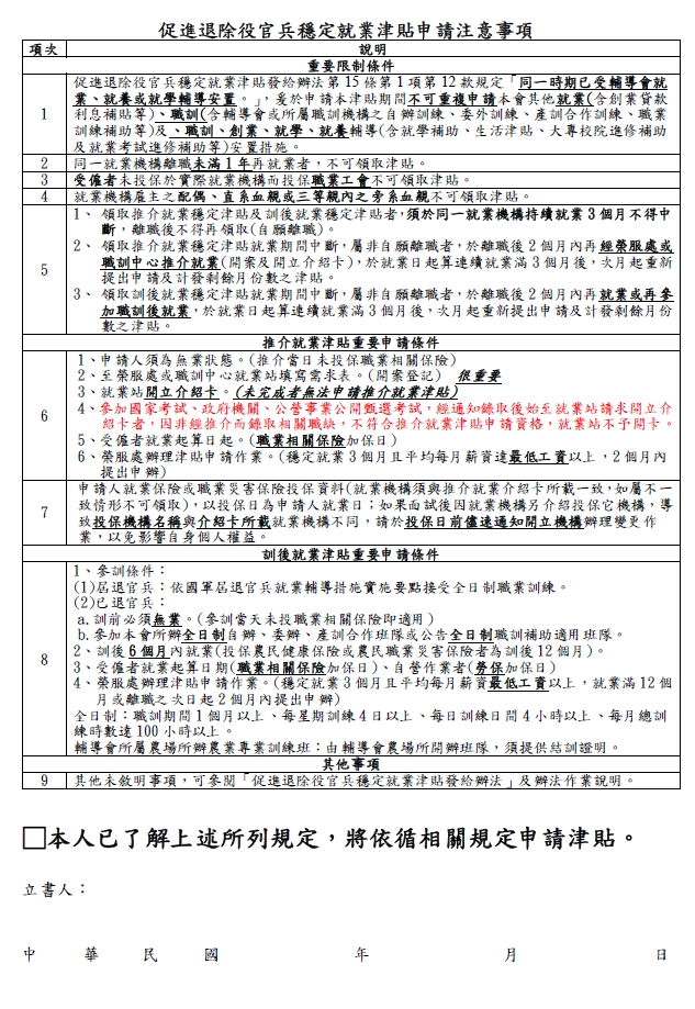 【就業資訊】 輔導會於115年1月9日修訂「促進退除役官兵穩定就業津貼申請注意事項」 『本次修訂係增列透過國家考試、政府機關、公營事業公開甄試等類此考試,經錄取後再至各地榮服處請求開立介紹卡,不符合輔導會推介就業津貼申請資格。』