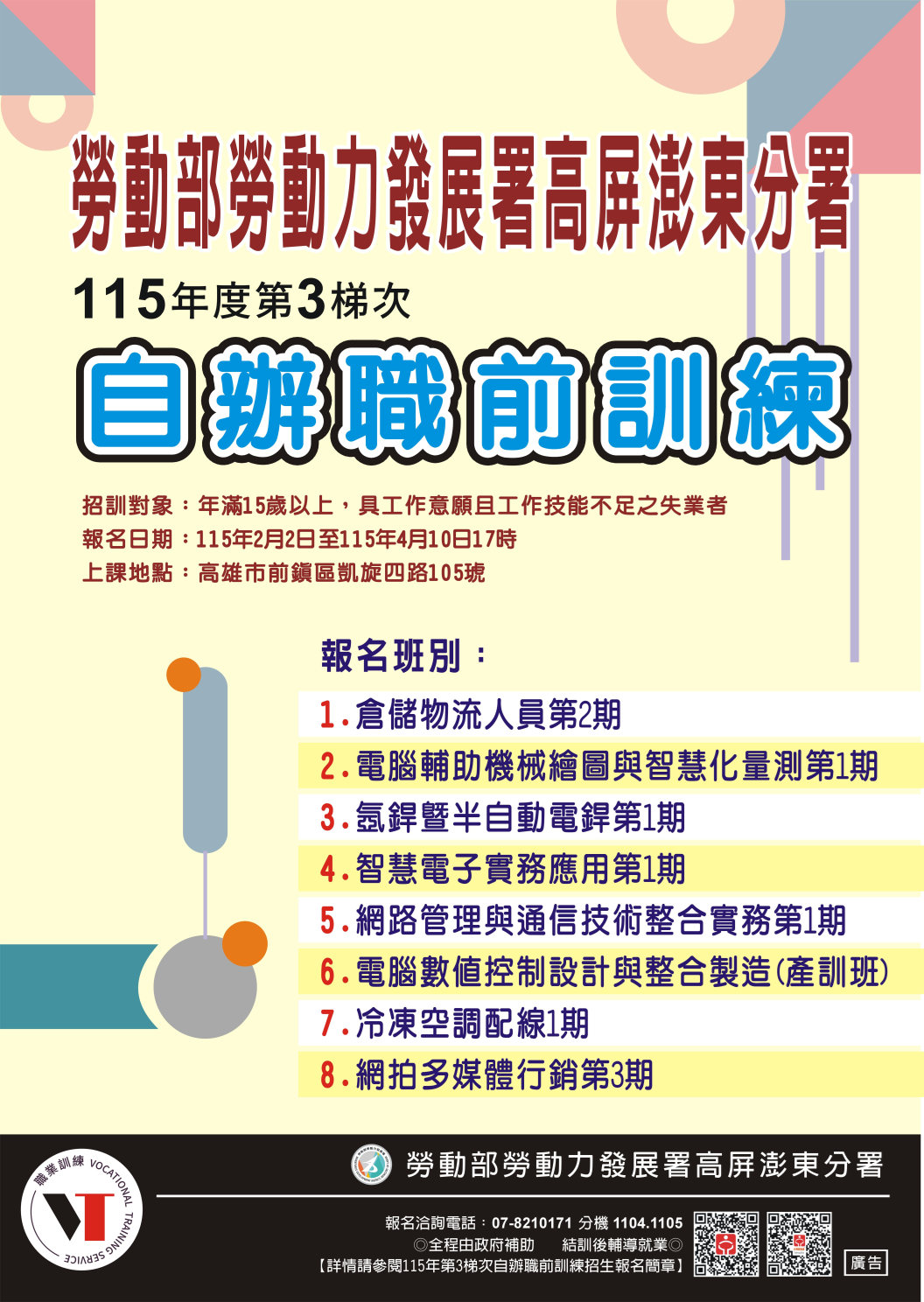 勞動部勞動力發展署高屏澎東分署115年度第3梯次自辦職前訓練海報