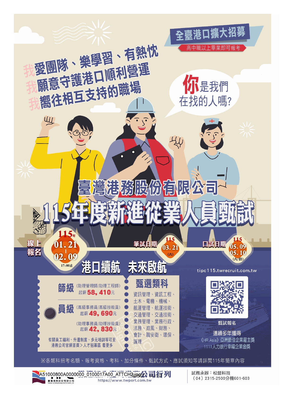 【就業考試快訊~臺灣港務股份有限公司115年新進從業人員甄試】