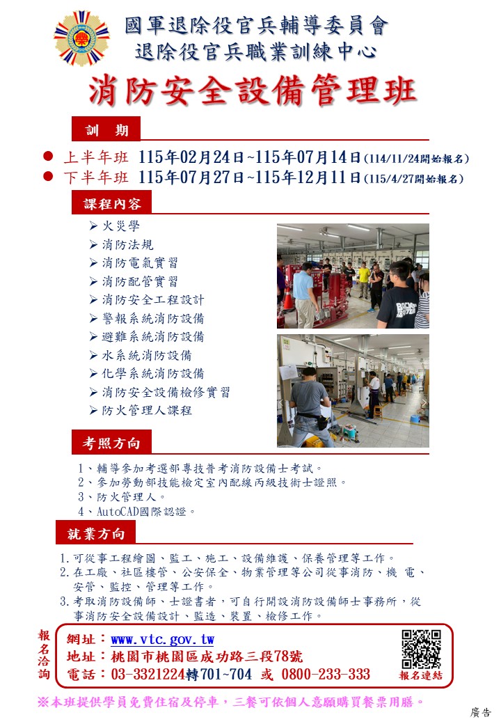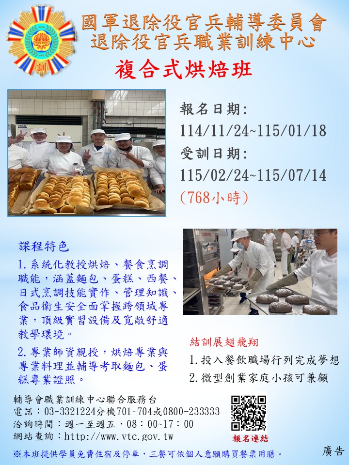 【輔導會職訓中心招生訊息】 🔔輔導會職訓中心部份班隊延長報名資訊! 👉受訓期間:115/02/24 ~ 115/07/14 👉受訓期間:115/02/24 ~ 115/07/20 有需要工作技能的粉絲,只要您符合身分是榮民(眷)、二類官兵及屆退官兵,歡迎踴躍報名唷!🔥