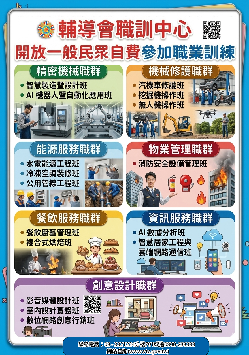 輔導會訂頒「國軍退除役官兵輔導委員會職訓機構自辦訓練開放民眾參訓試辦計畫」,並自即日起施行。
