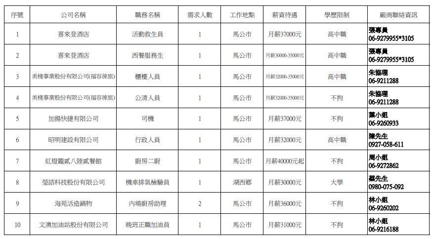 【澎湖縣榮服處】廠商職缺表(114.10.07)