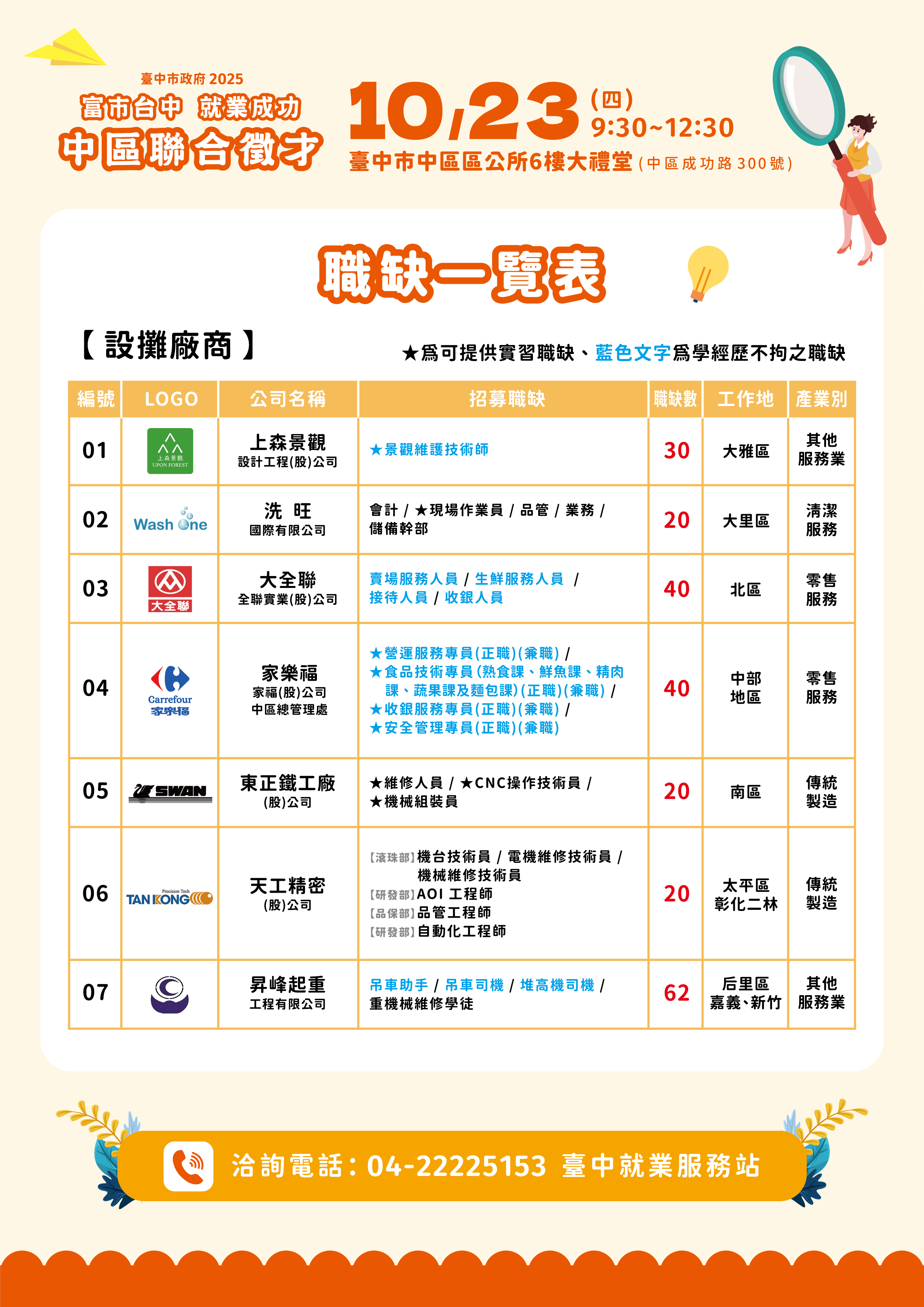 活動時間:114年10月23日(星期四)09:30~12:30 活動地點:臺中市中區區公所 (臺中市中區成功路300號6樓) 洽詢電話:04-22225153 臺中就業服務站 【活動內容】 邀請家樂福、大全聯、天工精密、昇峰起重等7家廠商徵才,提供超過200個工作機會,歡迎踴躍參加。 📋詳細職缺資訊請至台灣就業通