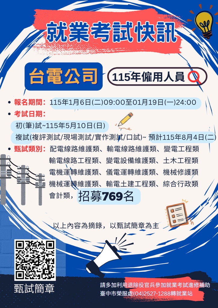 1. 預計甄試時間:115 年5 月10 日初(筆)試、115 年8 月4 日複試。 2. 預計錄取名額: 769 名。 3. 甄選類科:配電線路維護類、輸電線路維護類、變電工程類、輸電線路工程類、變電設備維護類、土木工程類、電機運轉維護 4. 甄試簡章:https://reurl.cc/pKVX0b 5. 以上內容為摘錄,以甄試簡章為主 ***歡迎多加利用退除役官兵就業考試進修補助*** 附件下載