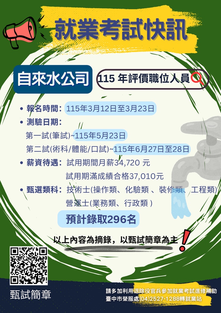 台灣自來水股份有限公司115 年評價職位人員甄試 2.考試時間:第㇐試(筆試)115 年5 月23 日(六)、第二試(術科/體能/口試)115 年6 月27 日(六)至6 月28 日(日) 3.甄選類科:暫定錄取296 人 4.甄試簡章:https://reurl.cc/YD1oA0 5.以上內容為摘錄,以甄試簡章為主