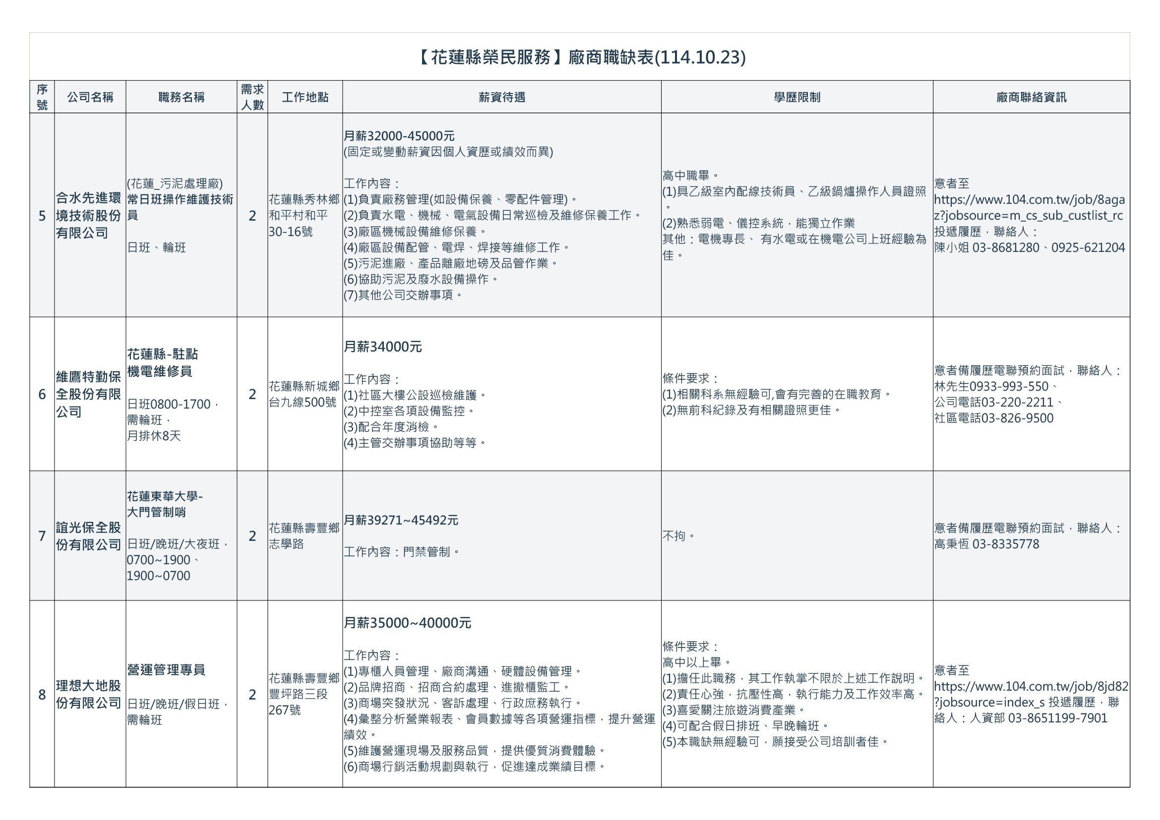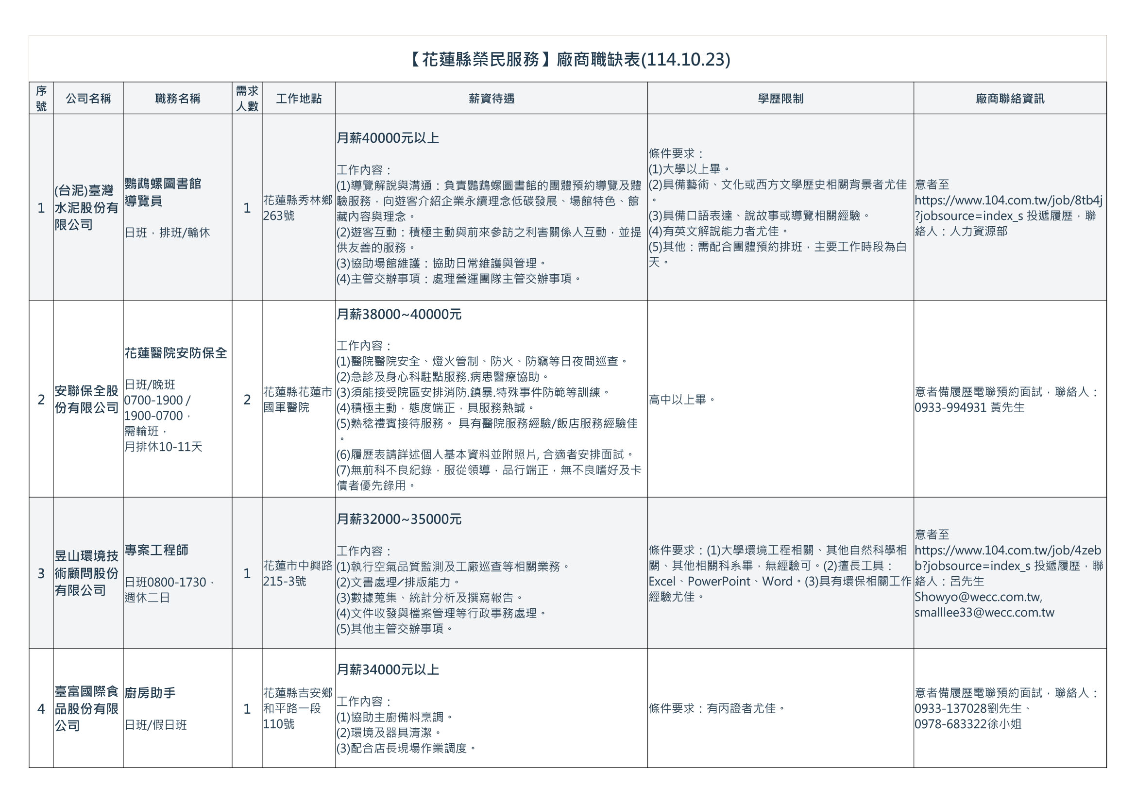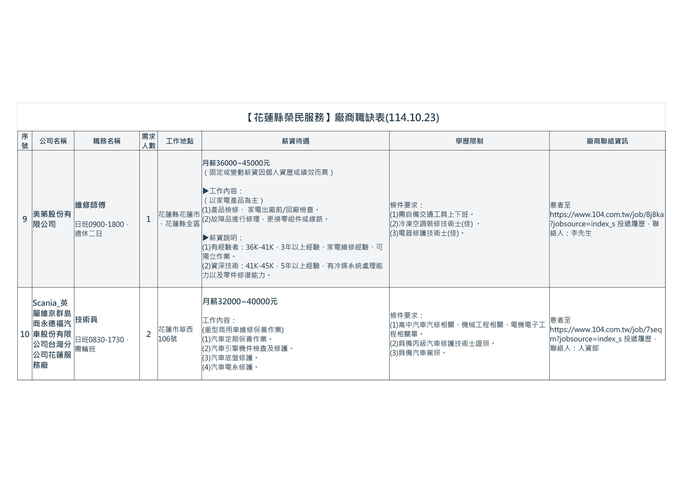 | 【花蓮縣榮民服務處】廠商職缺表(114.10.23).pdf | 114-10-23 | 10 |