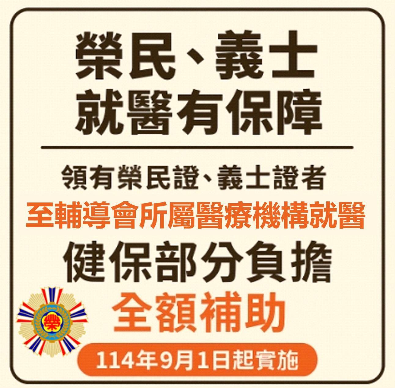 114年9月1日起「榮民及義士至輔導會所屬醫療機構就醫全額補助健保部分負擔」