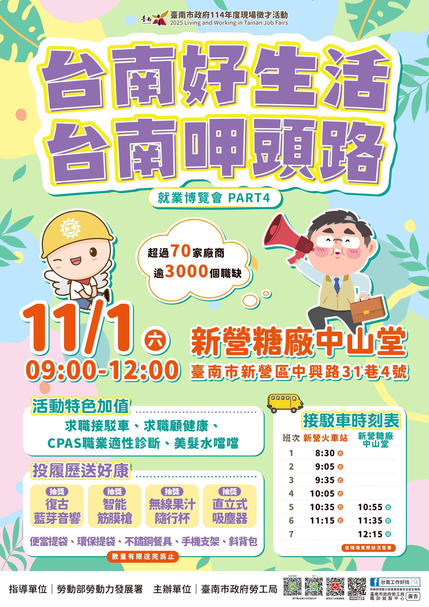 2025「台南好生活 台南呷頭路」第4場大型就業博覽會,將在11月1日(週六)上午9時至12時於新營區新營糖廠中山堂辦理,當日超過70家廠商,提供逾3000個工作機會;活動當天有「投履歷送好康」、「CPAS職業適性診斷」、「履歷健診」、「求職顧健康」、「按摩舒壓」及「美髮水噹噹」等多項免費服務,並可抽直立式吸塵器等好禮,詳洽:06-6330820。