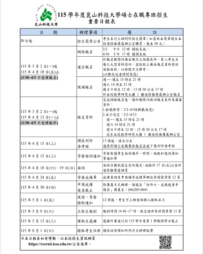 崑山科技大學碩士在職專班招生資訊 報名日期: 115年3月2日起至115年4月10日止(3/30-4/5不受理報名) 報名網址: https://recruit.ksu.edu.tw/recruitinfo/364.html 學校電話:(06)2727175 分機 306、307、308 附件下載