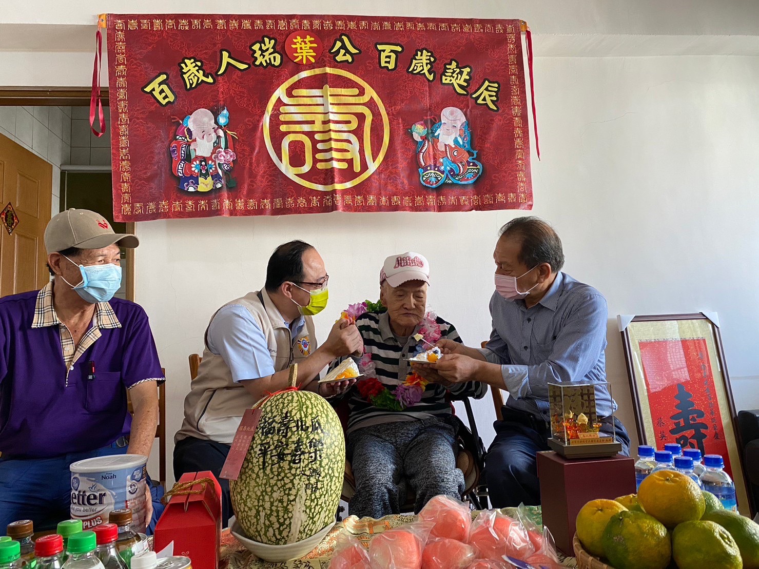 榮民葉復爺爺喜迎百歲嵩壽,臺南市榮服處王國能處長今(11)日偕同服務人員及邀請王安國里長前往祝賀,除代表致贈總統及行政院院長百歲壽屏,輔導會壽桃與金飾外,更獻上主任委員馮世寬上將軍親題「平安喜樂」及祝賀榮民多福多壽的「福壽北瓜」,與葉爺爺兒孫共渡百歲慶生,也象徵爺爺福壽綿長。